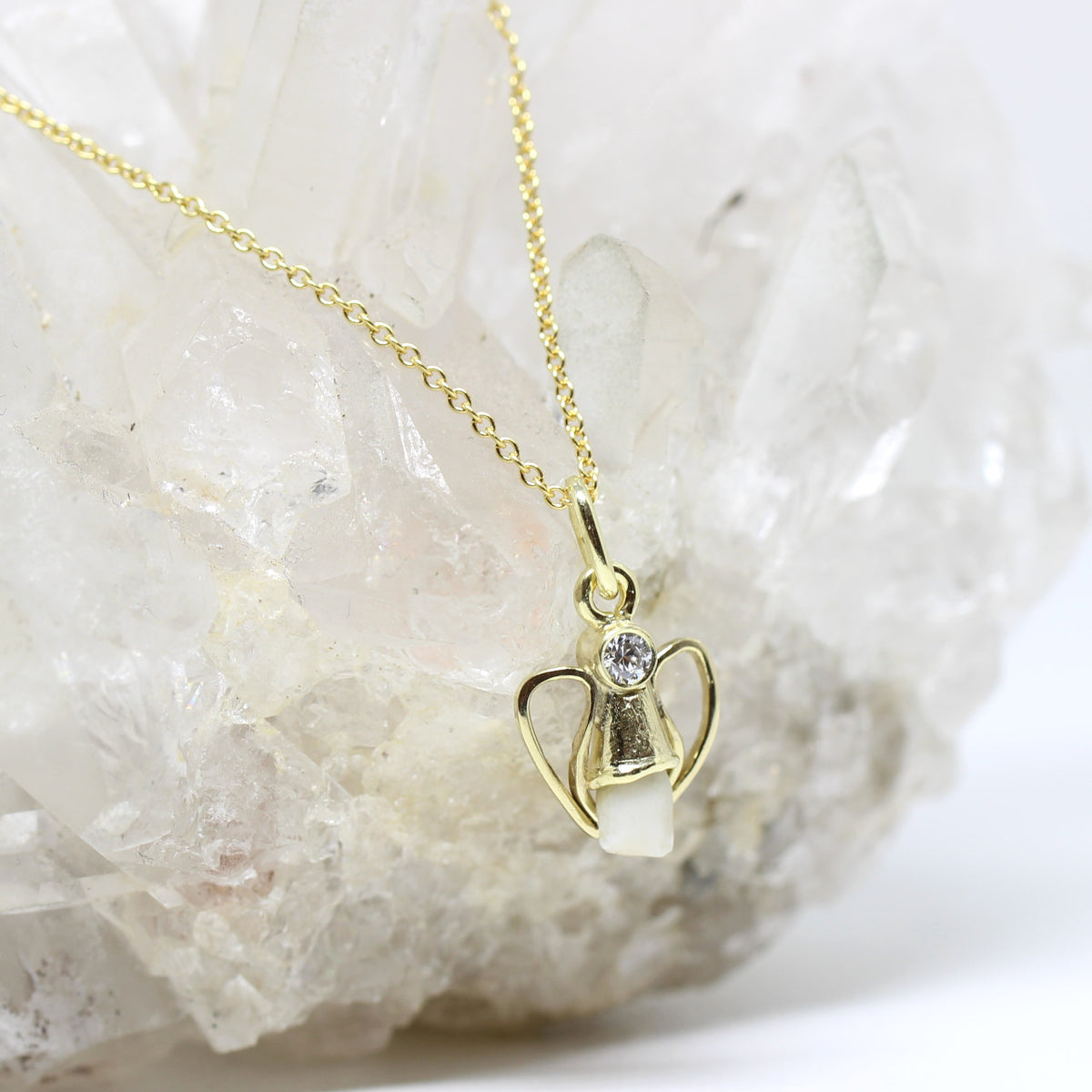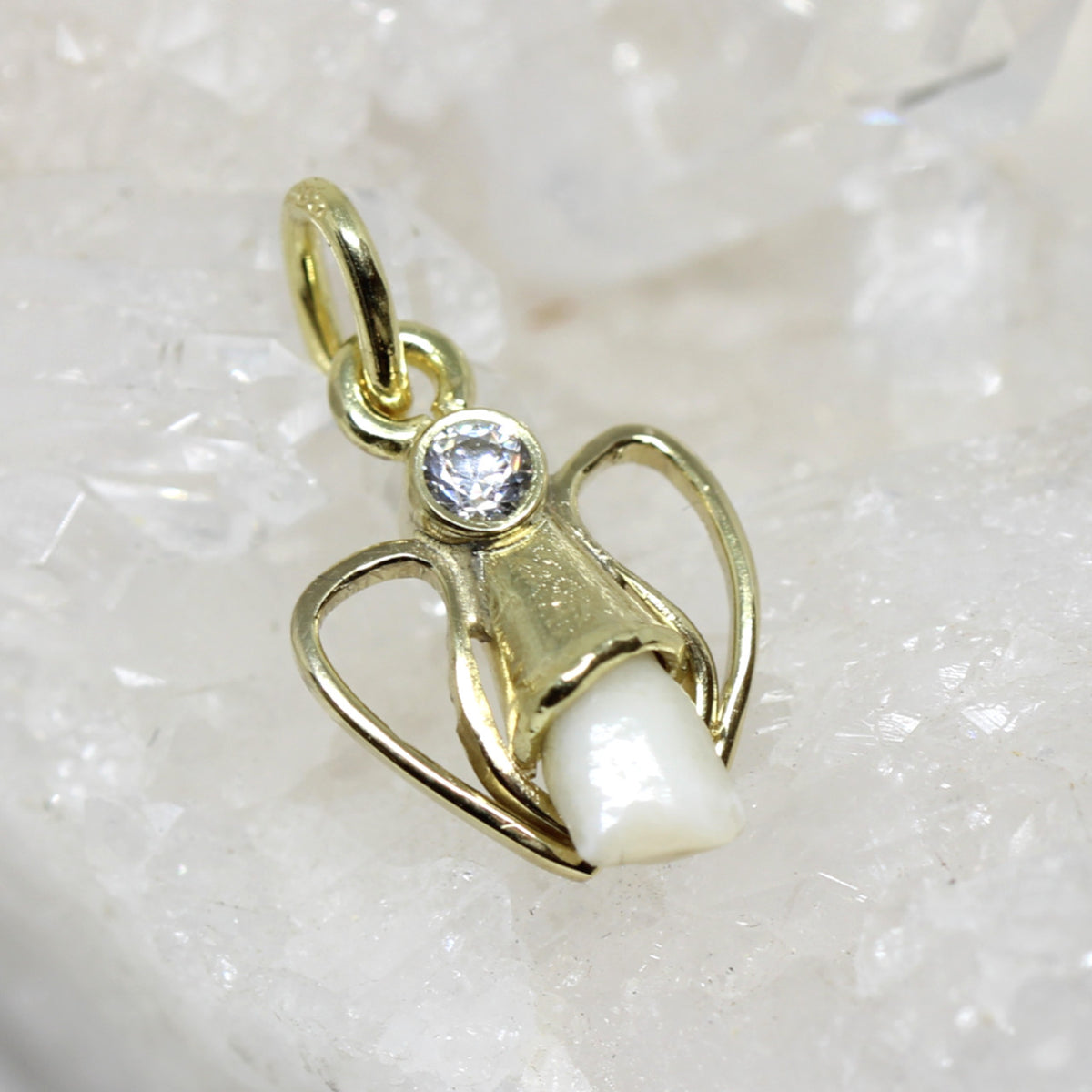 Du hast dich schon immer gefragt wie die Zahnfee aussehen könnte? Wir haben die Idee. Wir fertigen dein persönliches Schmuckstück mit Milchzahn. Schicke uns ganz einfach den Milchzahn deines Kindes zu und wir fertigen daraus diesen kleinen Engel aus 585er Gelbgold. Somit entsteht eine Erinnerung für die Ewigkeit. Als kleine Besonderheit haben wir einen Zirkonia eingearbeitet. Auf Anfrage können wir auch den Geburtsstein einfassen.