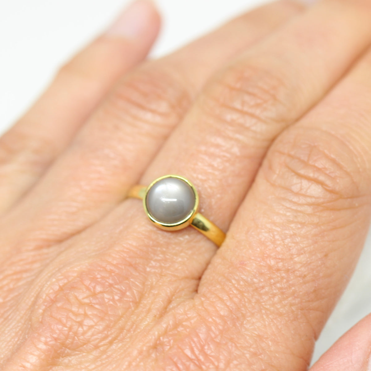 Dieser Ring ist ein absolutes Traumstück! Die zarte und hochwertige Verarbeitung verwandelt ihn in ein Lieblingsstück, das man nicht mehr ablegen möchte. Wir haben den polierten Ring aus 333er Gelbgold in unserer Manufaktur geschmiedet. Aus diesem Grund ist jedes Schmuckstück ein Unikat, das mit Sorgfalt und Liebe entsteht. Als Edelstein haben wir uns für einen grauen Mondstein entschieden welcher für Intuition und Hellsichtigkeit steht.