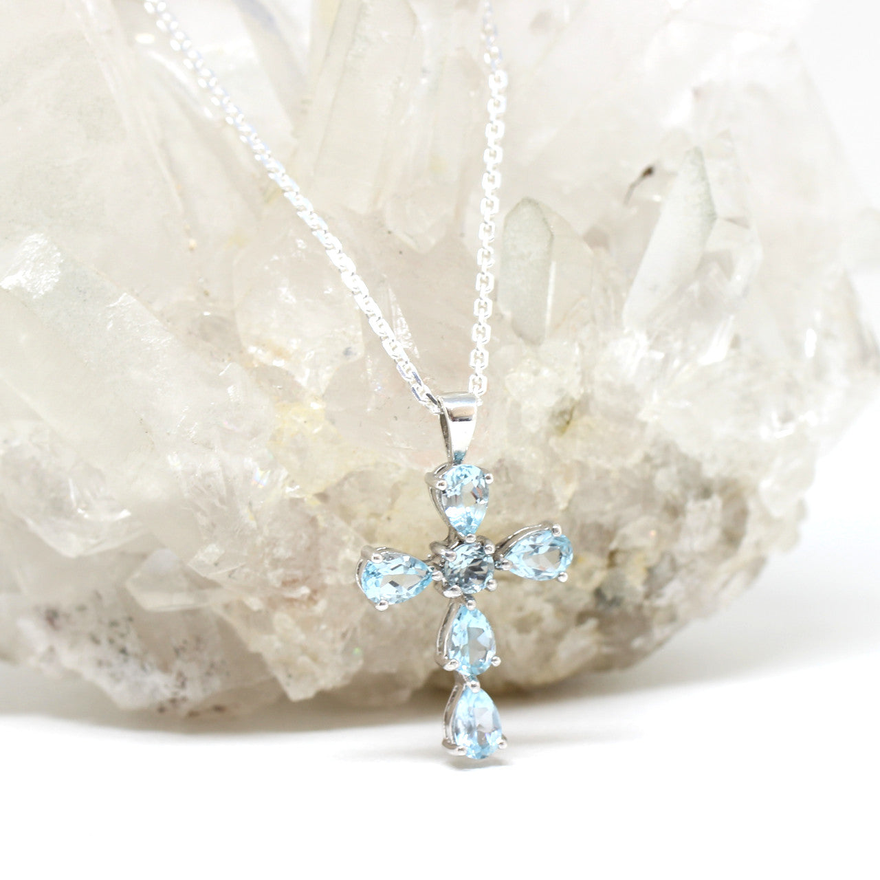 Ein absoluter Blickfang stellt dieses zauberhafte Kreuz dar. Es ist aus 925er Sterlingsilber hergestellt und mit strahlenden, Blautopasen ausgefasst.