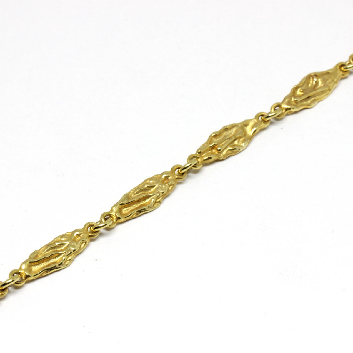 Ein individuelles und hochwertiges Schmuckstück das die Blicke auf sich zieht. Mit seiner außergewöhnlichen Struktur und Bearbeitungstechnik wird dieses Armband zu einem echten Einzelstück. Wir haben es selbst kreiert und hergestellt. Das Material besteht aus 333er Gelbgold und macht den Armschmuck zu einem besonderen Unikat.