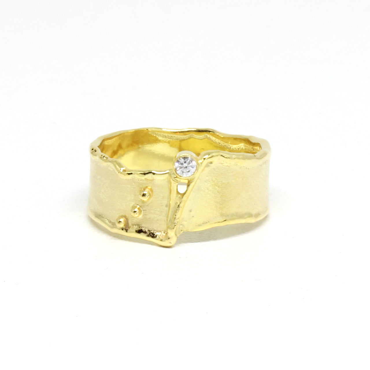 Diesen ansprechenden Goldring haben wir selbst kreiert und angefertigt. Er wurde in unserer Werkstatt aus 333er Gelbgold hergestellt. Seine Einzigartige Bearbeitungsart macht ihn zu einem echten Unikat. Man erkennt sofort das dieses Schmuckstück keine Massenware, sondern echte Goldschmiedearbeit ist. Als kleinen Akzent haben wir einen Zirkonia eingearbeitet.