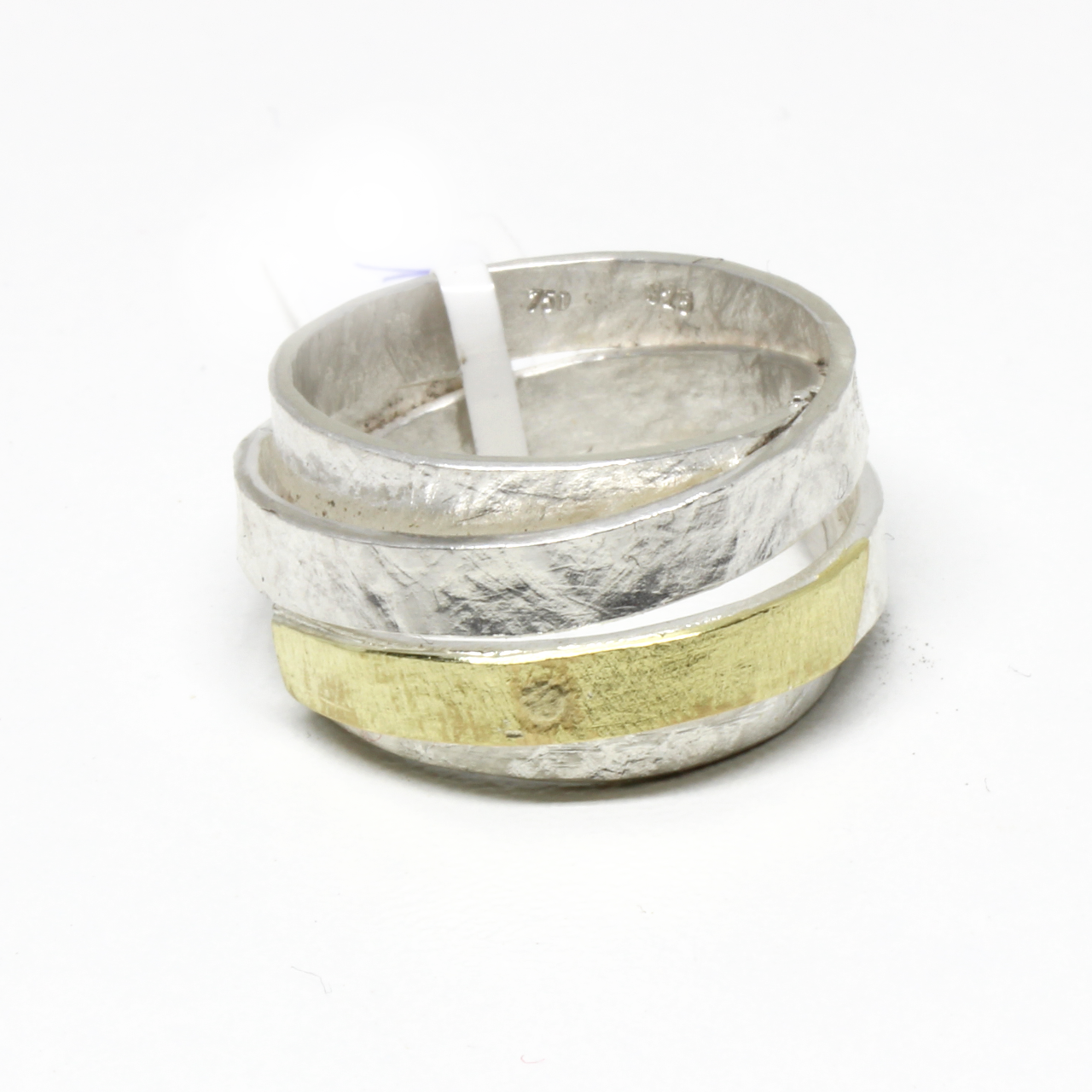 Dieses schöne Schmuckstück haben wir in unserer kleinen Goldschmiede hergestellt. Das Grundmaterial dieses Ringes ist 925 Sterlingsilber, das wir zum Teil mit 750 Gelbgold bearbeitet haben. Somit haben wir ein trendiges Stück gearbeitet das man hervorragend zu Silber und Goldschmuck tragen kann. Die Silberne Seite arbeiteten wir dabei mit einer anderen Oberflächenstruktur als das Gold, um noch einen deutlicheren Kontrast zu schaffen.