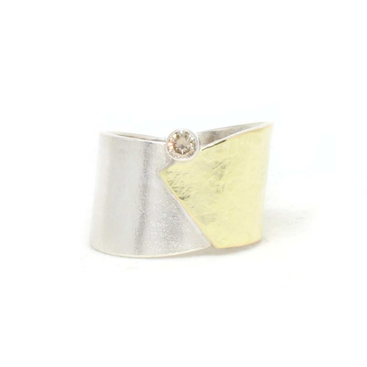 Eleganter Ring in malerischer Optik. Bei diesem aparten Schmuckstück haben wir 925er Silber mit 750er Gelbgold vereint. Somit haben wir ein trendiges Stück gearbeitet das man hervorragend zu Silber und Goldschmuck tragen kann.