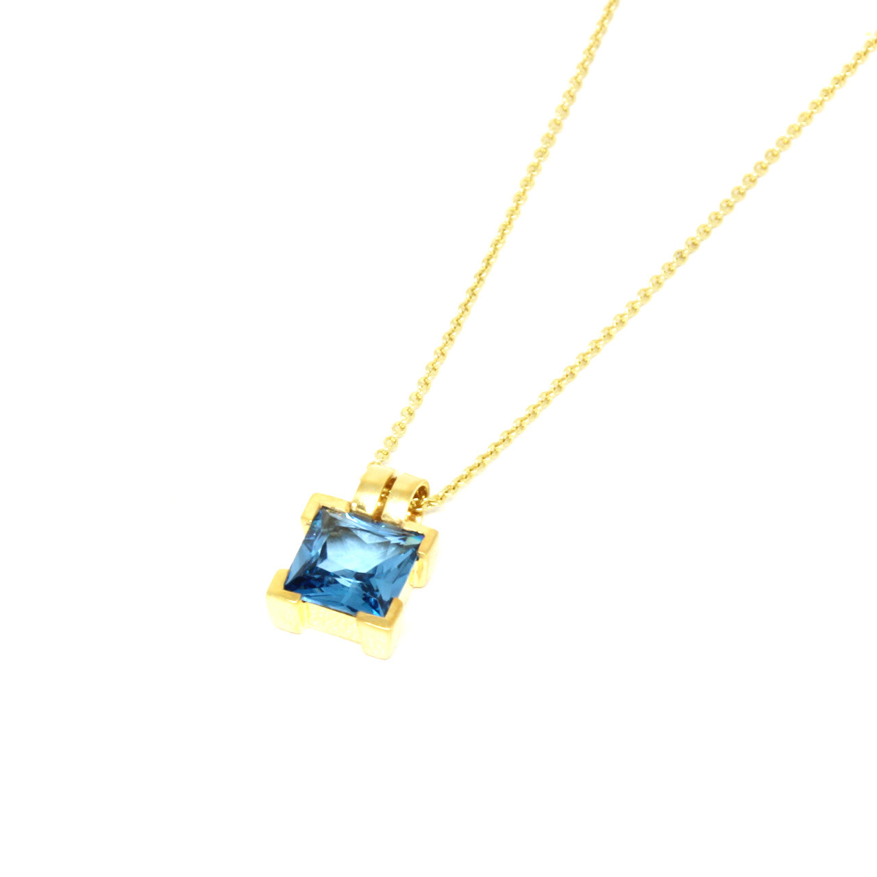 Klein und so fein zeigt sich dieser Anhänger aus 333er Gelbgold. Die Oberfläche ist poliert. Den Gegensatz zum Gelbgold bildet der funkelnde synthetische Topas. Beide Elemente vereint ergeben ein modernes und besonderes Schmuckstück.