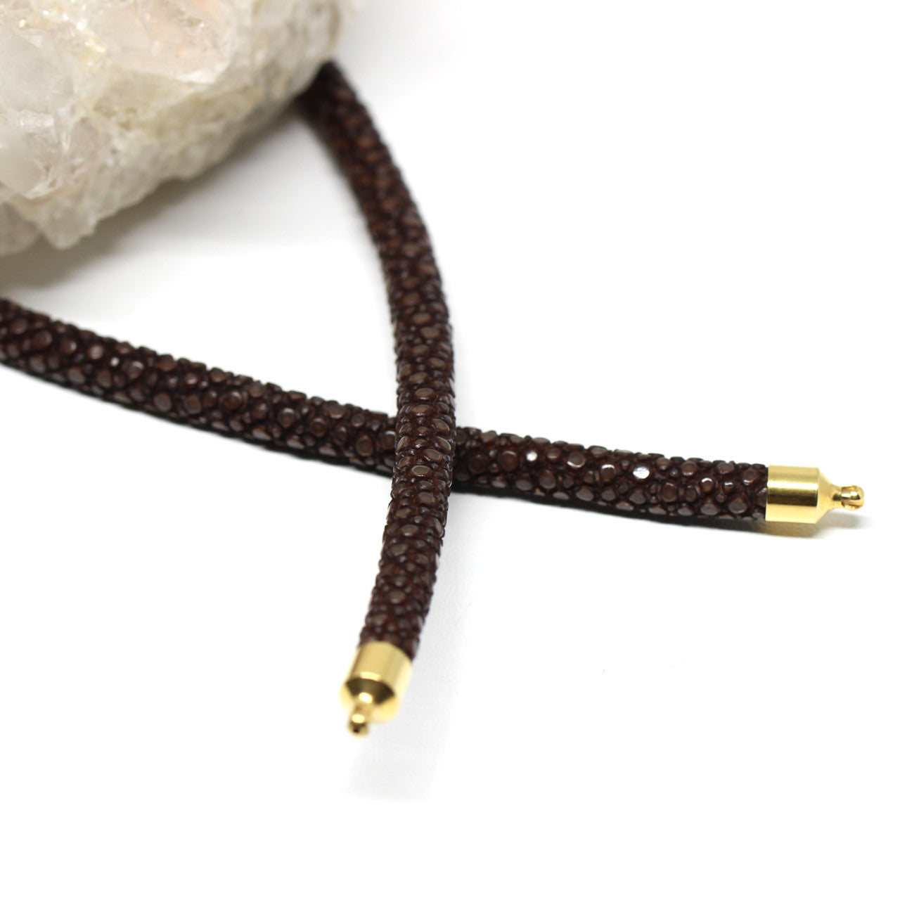 Das braun des Rochenleders passt zu allen Farben und Formen der Wechselschließen. Ideal geeignet für Kombinierer, die auch gerne mal neue Materialien für ihr Wechselschließensystem testen wollen. Mit vergoldeten Endstücken.