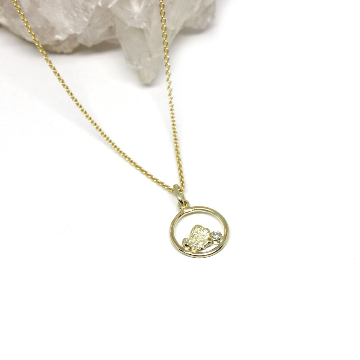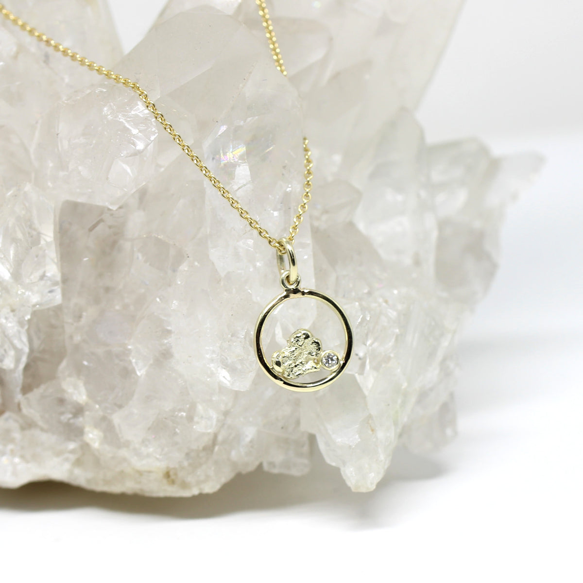Dieser extravagante Anhänger ist ein Genuss. Wir haben ihn aus 585er Gelbgold hergestellt. Das besondere an diesem Schmuckstück ist das kleine eingearbeitete Nugget. Dieses haben wir mit einem Brillanten von 0,03 ct veredelt.