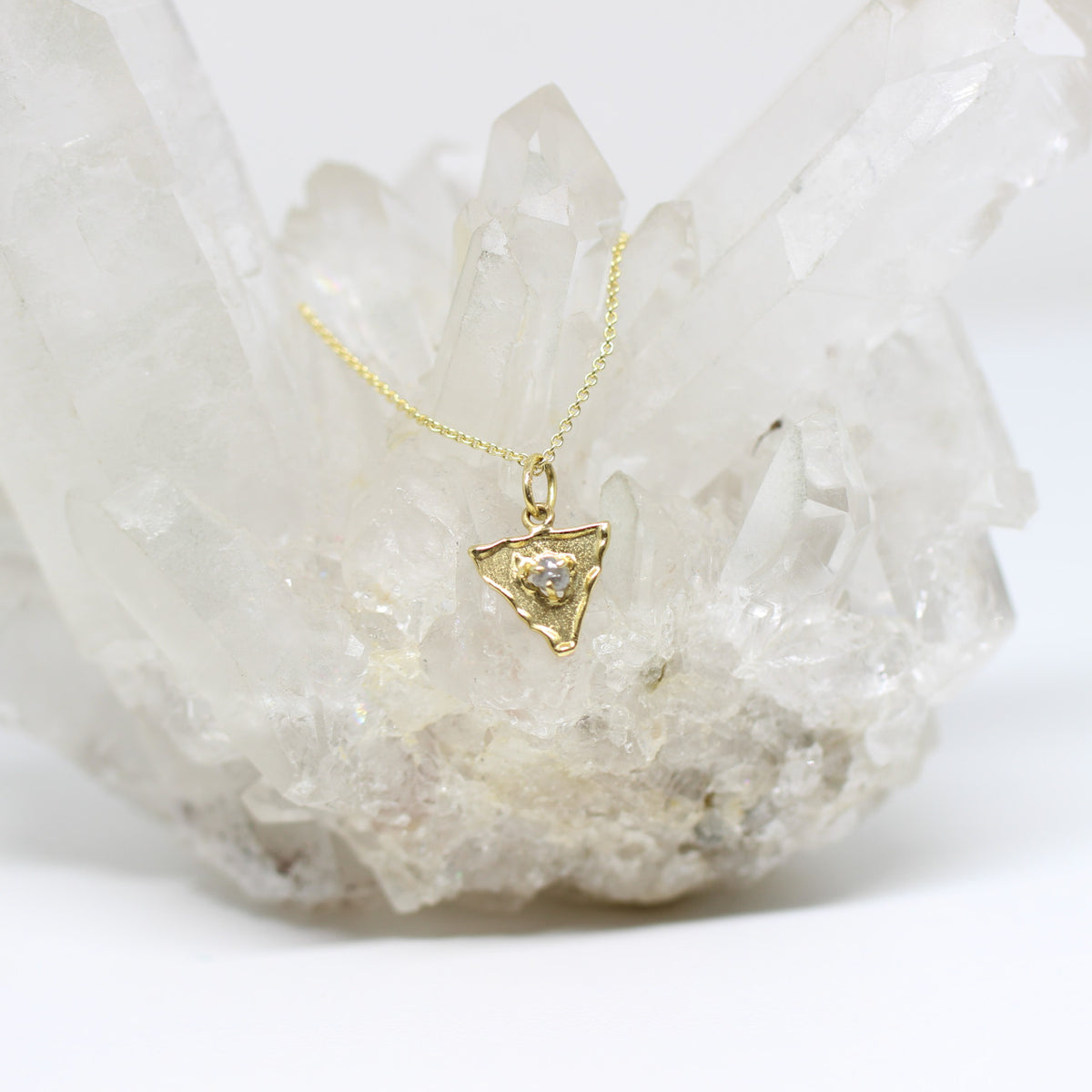 Ein besonderes Schmuckstück bekommst du mit diesem Anhänger aus 585er Gelbgold. Wir haben ihn in unserer Manufaktur designt und hergestellt. Als Blickfang haben wir einen kleinen Rohdiamanten eingearbeitet. Dieses Schmuckstück kombiniert mit einer handgefertigten Kette sieht einfach traumhaft schön aus.