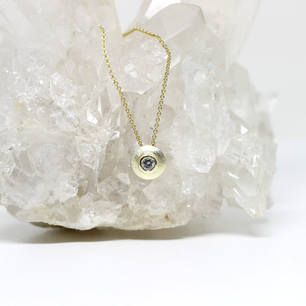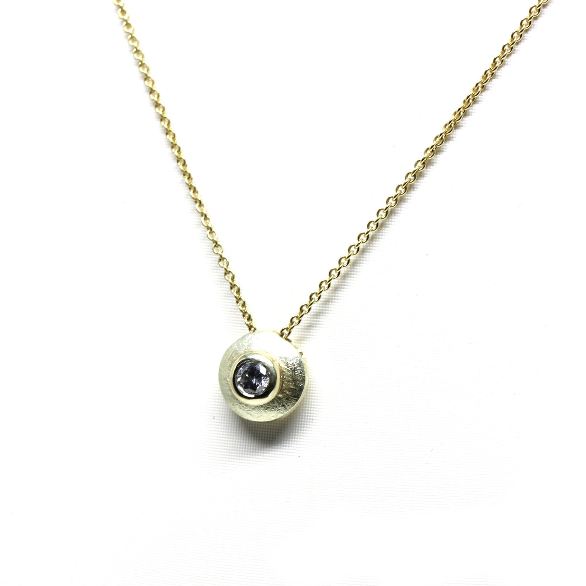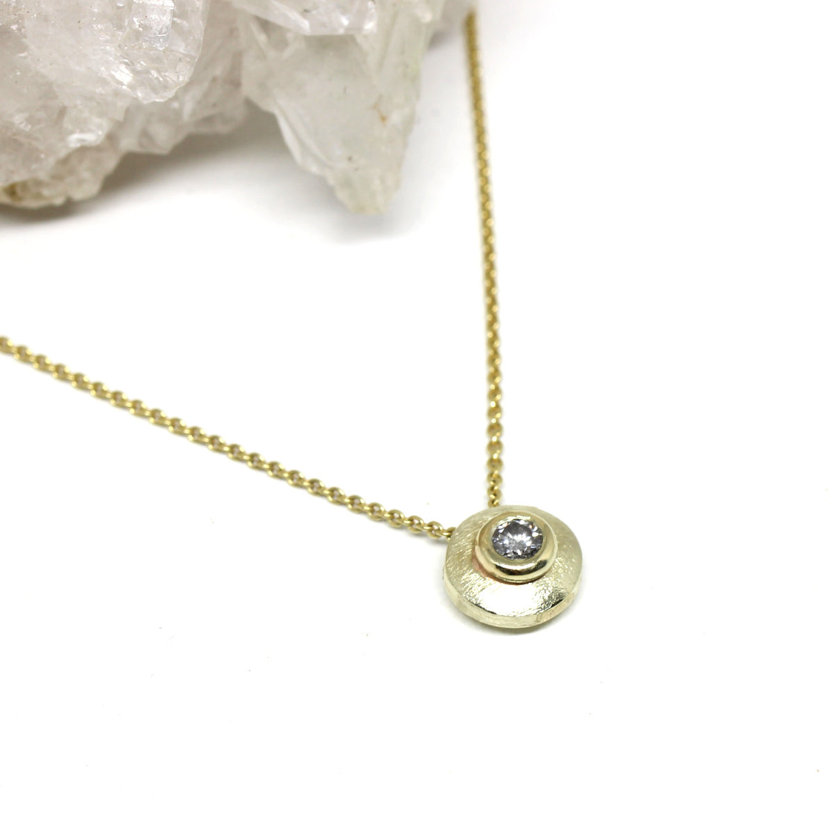 Dieser extravagante Anhänger ist ein Genuss. Wir haben ihn aus 585er Gelbgold hergestellt und die Oberfläche eismattiert. Das exklusive an diesem Schmuckstück ist der Brillant von 0,15 ct. Es handelt sich dabei um einen sogenannten Salt and Pepper Brillant. Dieser hat einen dezenten Grauton. Vereint mit dem Gelbgold ist dieser Edelstein ein wahrer Augenschmaus.