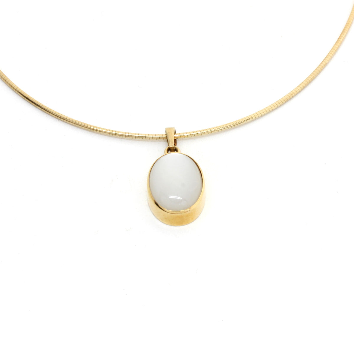 Dieser schöne Anhänger stammt aus unserer kleinen Werkstatt. Der Fokus liegt hier auf dem weißen Mondstein. Sein samtiger Schimmer verändert je nach Lichteinfall seine Intensität. Eingefasst ist der Schmuckstein in 333er Gelbgold.
