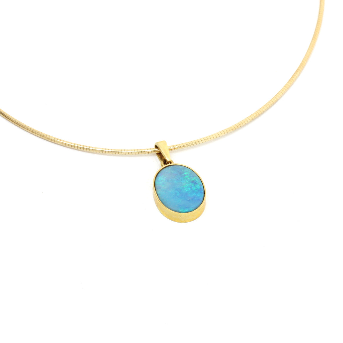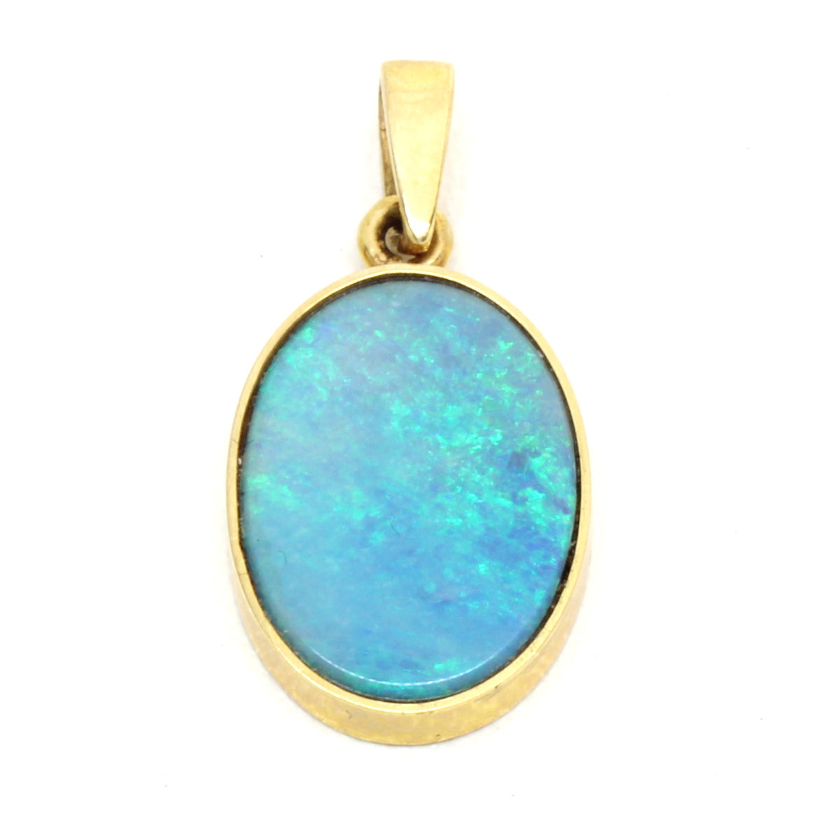Dieser schöne Anhänger hält seinen Fokus auf einer wunderschönen Opaldoublette. Der Stein schillert in traumhaften blau und Grüntönen. Eingefasst haben wir den Opal in 333er Gelbgold. Vor allem in einem Reif sieht der Anhänger sehr elegant aus.