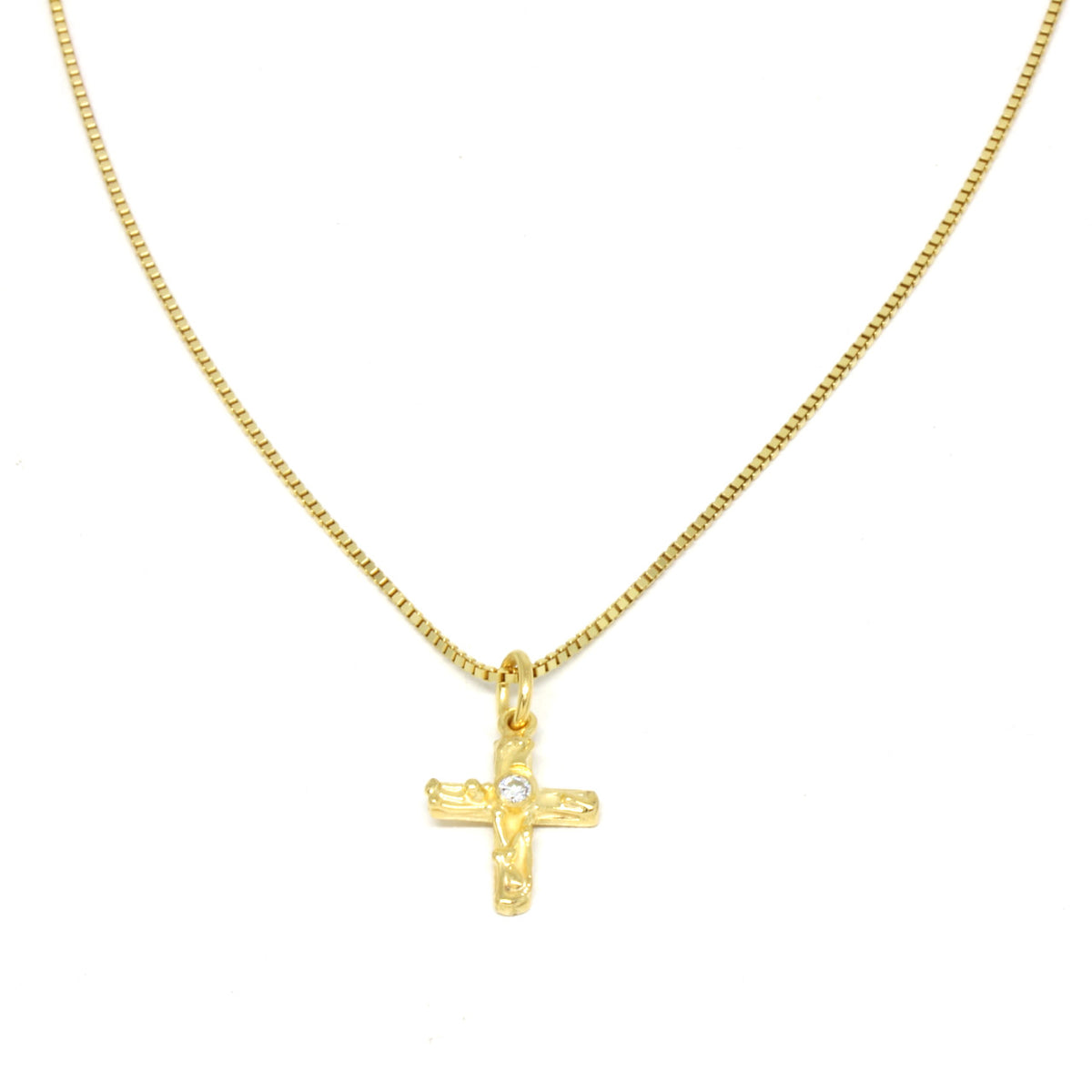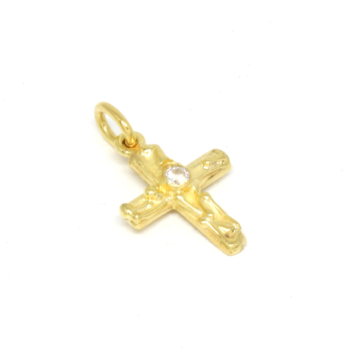 Dieses filigrane Kreuz ist aus 333er Gelbgold hergestellt. Es ist mit unserer speziellen Oberflächenstruktur bearbeitet und trägt einen kleinen Zirkonia. Die unverwechselbare Handwerkskunst macht diesen Anhänger zu einem individuellen und zeitlosen Schmuckstück.