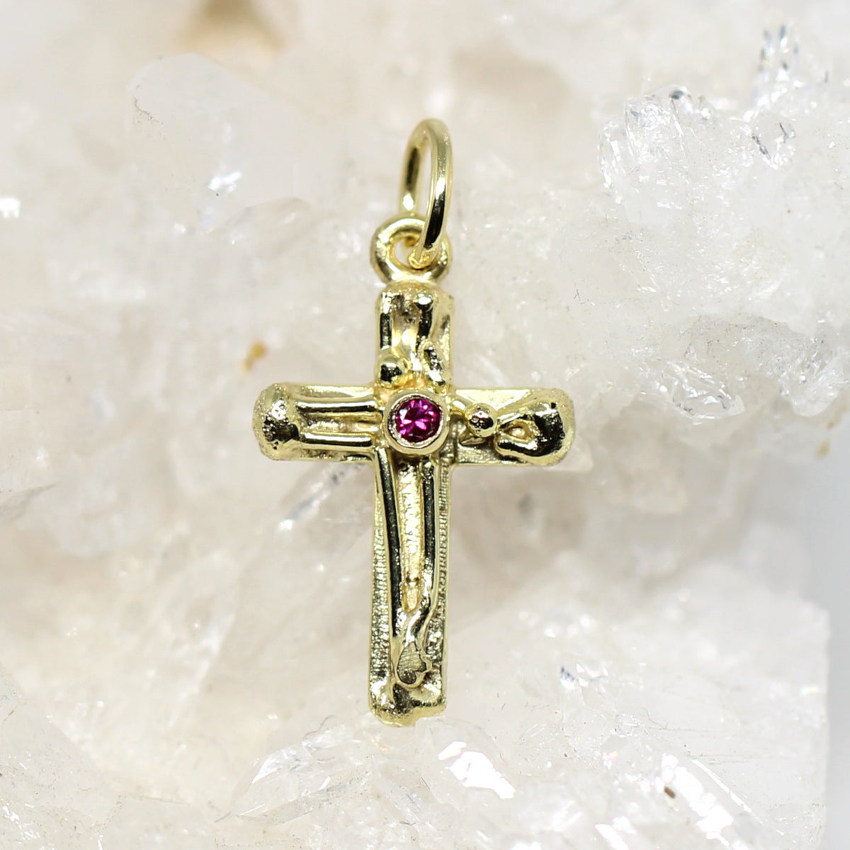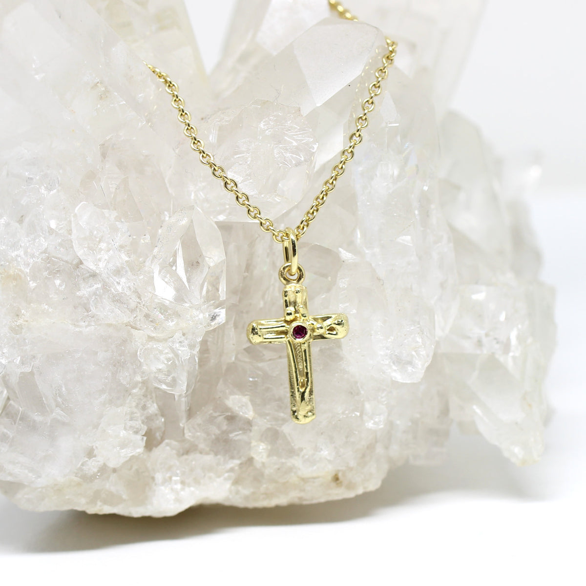 Dieses filigrane Kreuz ist aus 333er Gelbgold hergestellt. Es ist mit unserer speziellen Oberflächenstruktur bearbeitet und trägt einen kleinen Rubin. Die unverwechselbare Handwerkskunst macht diesen Anhänger zu einem individuellen und zeitlosen Schmuckstück.
