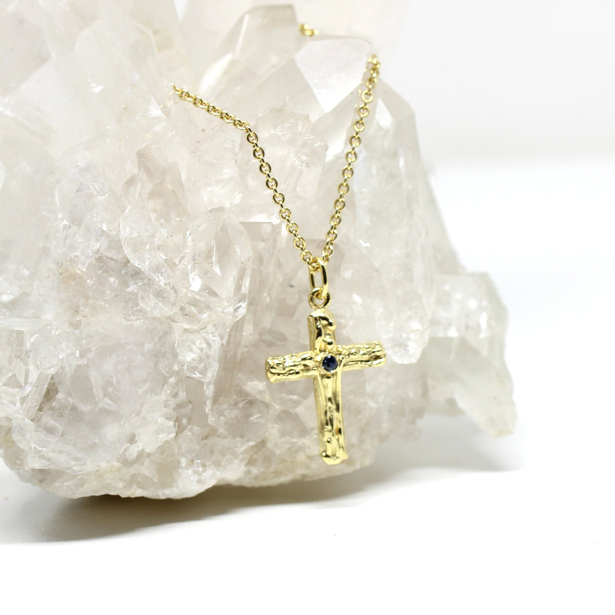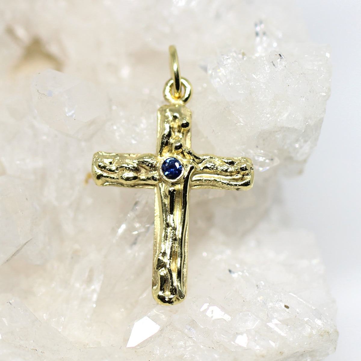 Dieses filigrane Kreuz ist aus 333er Gelbgold hergestellt. Es ist mit unserer speziellen Oberflächenstruktur bearbeitet und trägt einen kleinen Saphir. Die unverwechselbare Handwerkskunst macht diesen Anhänger zu einem individuellen und zeitlosen Schmuckstück.