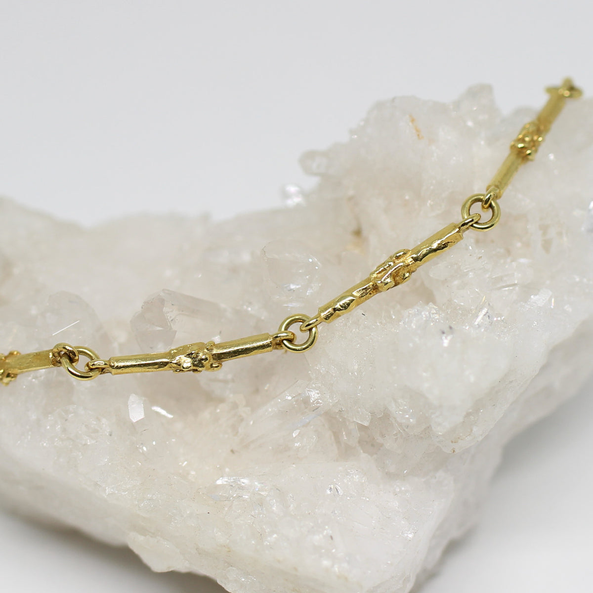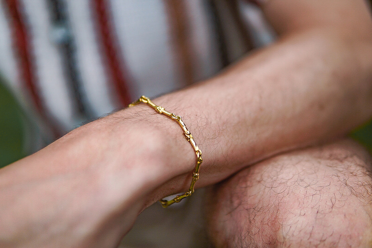 Ein zartes Schmuckstück, das den Blick auf sich zieht. Mit seiner individuellen Struktur und Bearbeitungstechnik wird dieses Armband zu einem echten Einzelstück. Wir haben es selbst entworfen und hergestellt. Das Material besteht aus 333er Gelbgold und macht den Armschmuck zu einem besonderen Unikat.