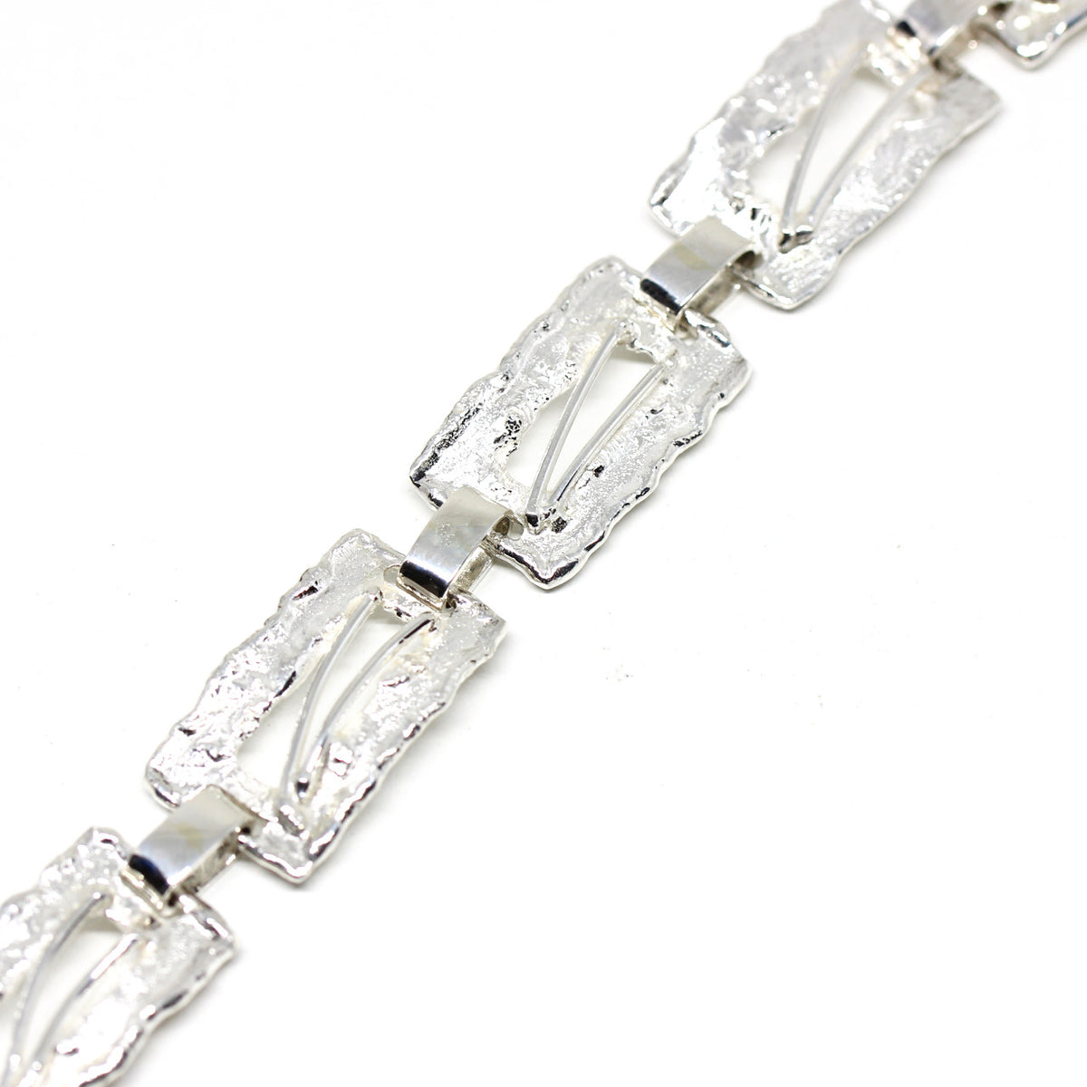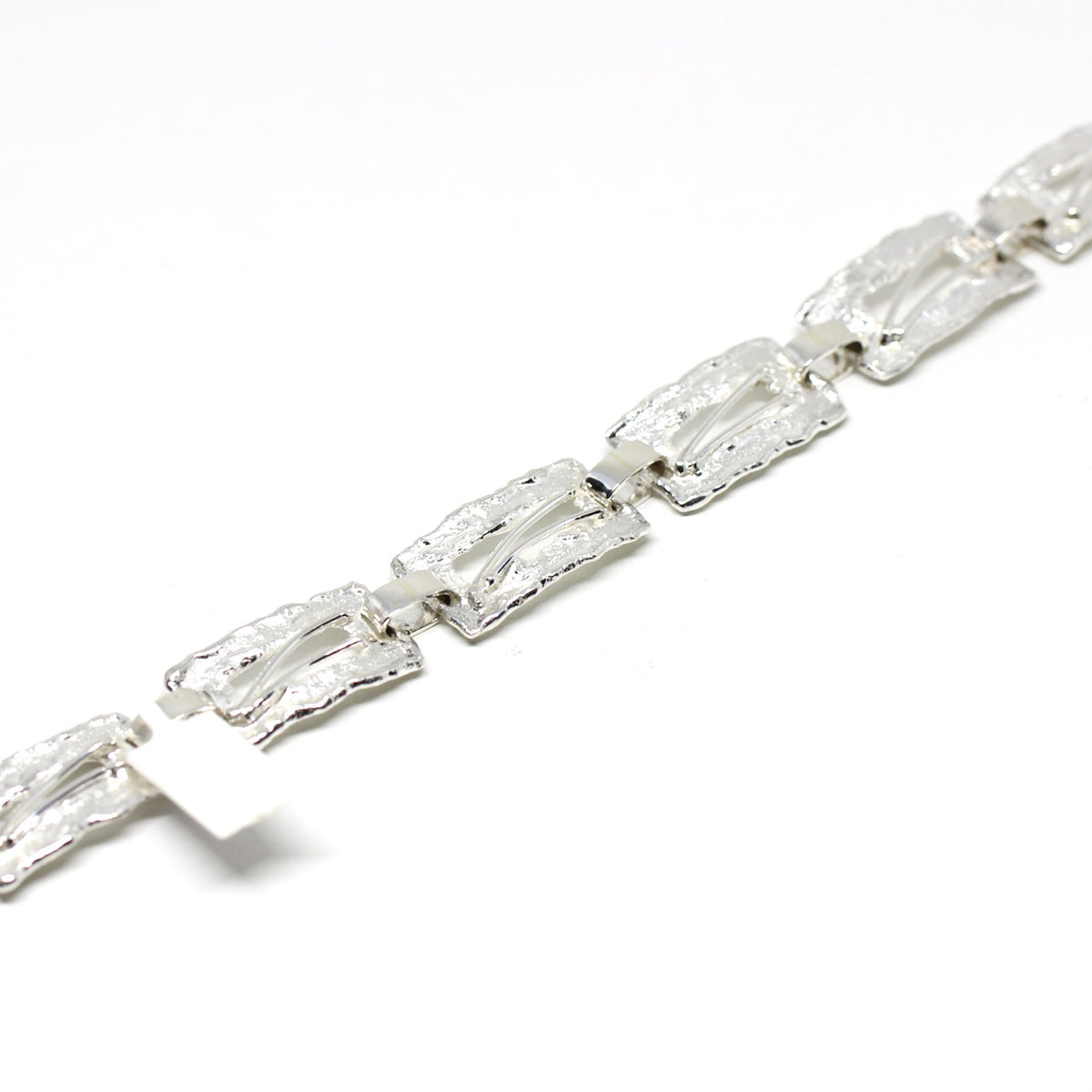 Dieses individuelle Schmuckstück ist mit viel Liebe zum Detail in unserer Werkstatt entwickelt worden. Jedes einzelne Glied und die dazugehörige Öse wurde von Hand angefertigt. Bei diesem Armband ist keinerlei Standard zu erkennen. Es ist durch und durch ein Armschmuck der sich von Gewöhnlichkeit abhebt. Die Teile sind mit unserer speziellen Technik bearbeitet und wurden anschließend poliert.