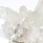 Dieses individuelle Schmuckstück ist mit viel Liebe zum Detail in unserer Werkstatt entwickelt worden. Bei diesem Armreif ist keinerlei Standard zu erkennen. Er ist durch und durch ein Armschmuck der sich von Gewöhnlichkeit abhebt. Das Vorderteil ist mit unserer speziellen Technik bearbeitet und es wurden funkelnde Zirkonia eingearbeitet. Die Spange ist so angefertigt das sie nicht Steif wie ein Armreif ist, sondern an zwei punkten beweglich. Somit ist die Spange angenehm zu tragen. Verschlossen wird sie mit einem Karabinerverschluss.
