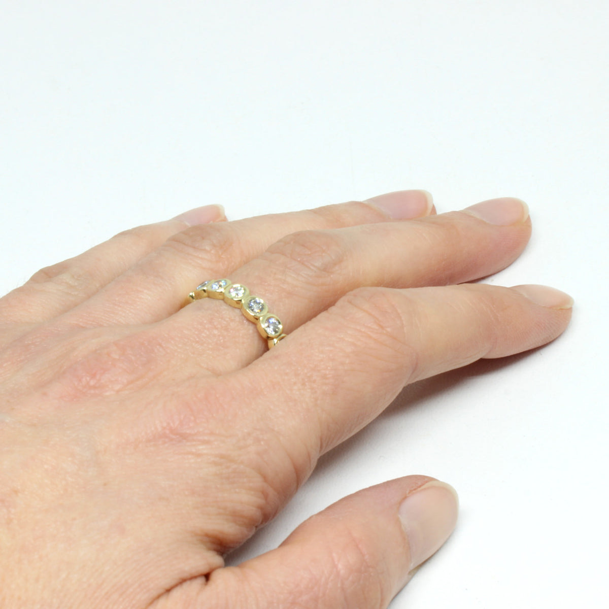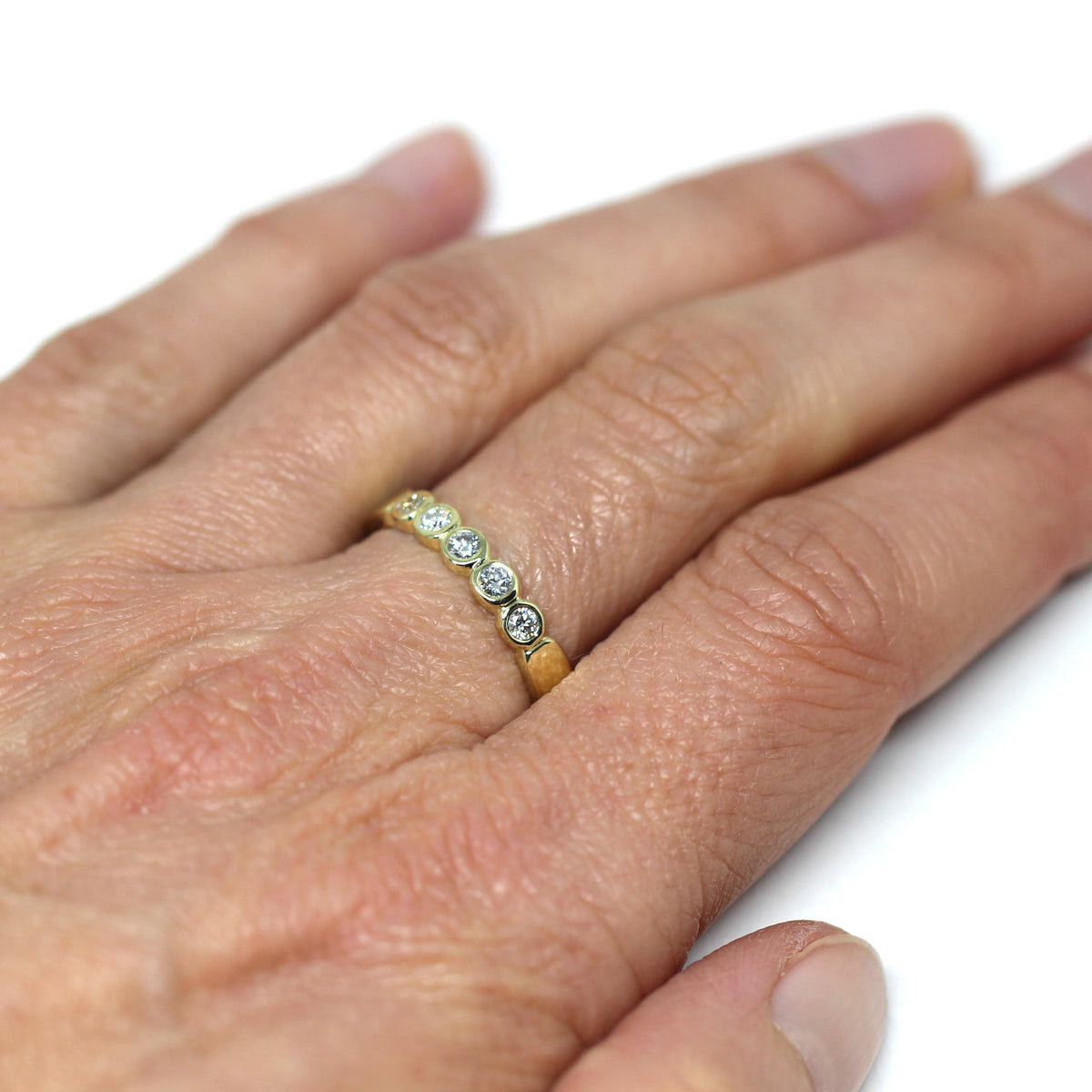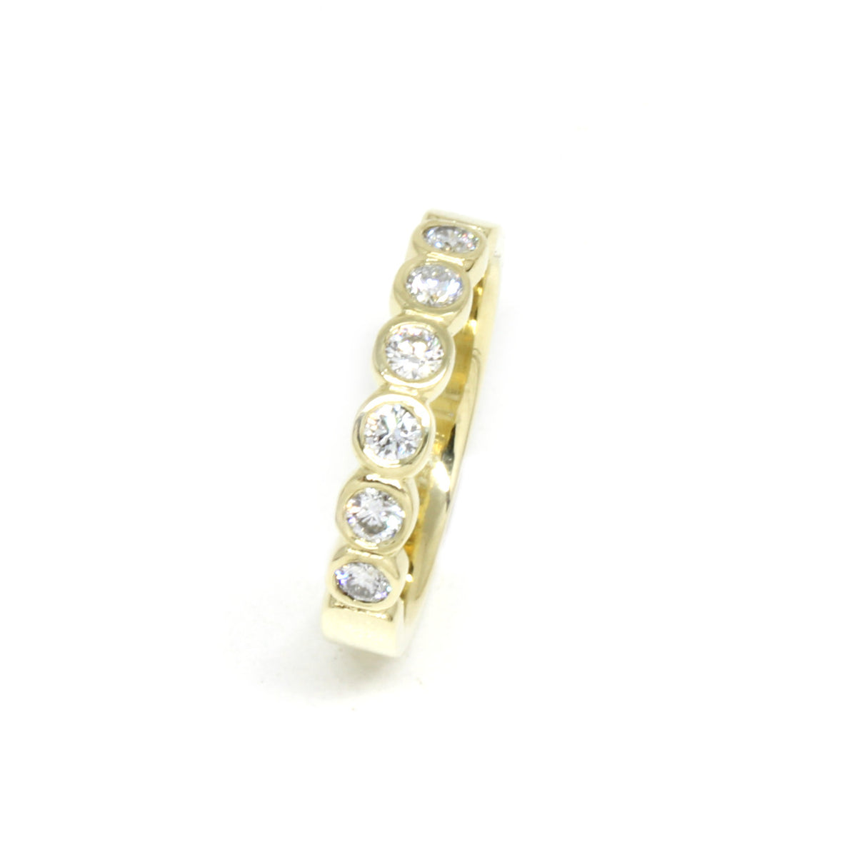 Dieser besondere Ring ist ein wunderschönes Schmuckstück für die Ewigkeit. Der massive Ring aus kostbarem 585er Gelbgold ist in zwei Varianten verfügbar. Zum einen haben wir ihn mit 6 Brillanten bestückt, die insgesamt 0,60 ct erreichen, zum anderen haben wir ihn mit 5 Brillanten zu insgesamt 0,25 ct im Sortiment. Die Steine sind in bester Qualität sind direkt in das Edelmetall eingearbeitet und somit wird ein lästiges hängenbleiben vermieden. Aus diesem Grund eignet sich dieser Ring sehr gut für den Alltag und man kann ihn wunderbar zu einem anderen Ring dazu kombinieren. Er eignet sich auch sehr gut als Verlobungsring da er Problemlos zum späteren Ehering gesteckt werden kann.