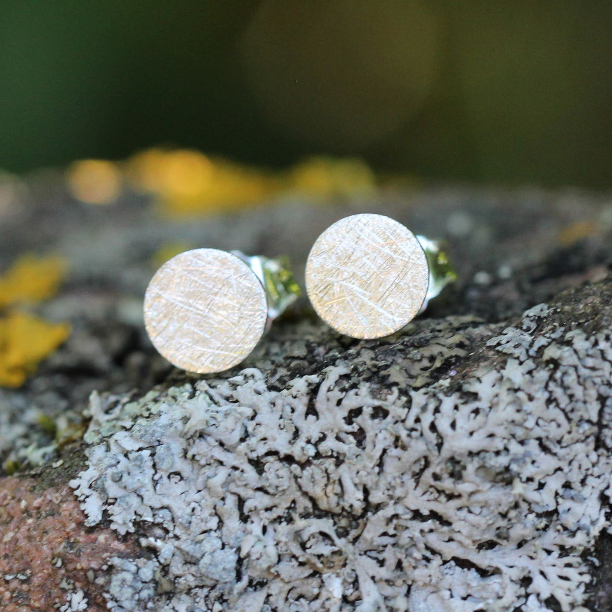 Diese schönen Ohrstecker sind aus 925 Sterlingsilber angefertigt. Die runden Scheiben sind eismattiert und erhalten dadurch eine spezielle Optik. Die Ohrstecker haben wir in unserer Werkstatt handgeschmiedet.