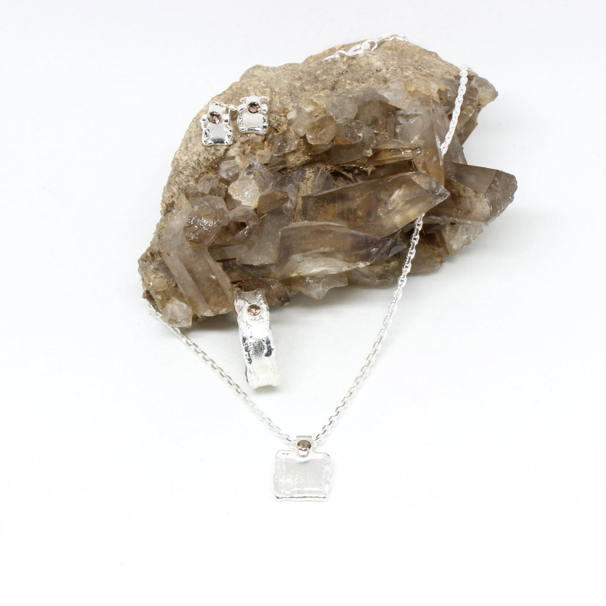 Das perfekte Set für Frauen die dezenten und doch raffinierten Schmuck mögen. Die einzelnen Schmuckstücke haben eine klare Form die durch die zeitlose Struktur besonders werden. Als Goldschmiedearbeit ist dieses Set individuell und wird niemals unmodern. Die Entstehung der einzelnen Schmuckornamente liegt in unserer kleinen Werkstatt, wo sie mit Liebe, Schweiß und Fingerfertigkeit hergestellt werden. In das 925 Sterlingsilber haben wir einen kleinen, geschliffenen Rauchquarz eingefasst der das leicht rustikale mit Eleganz vereint.