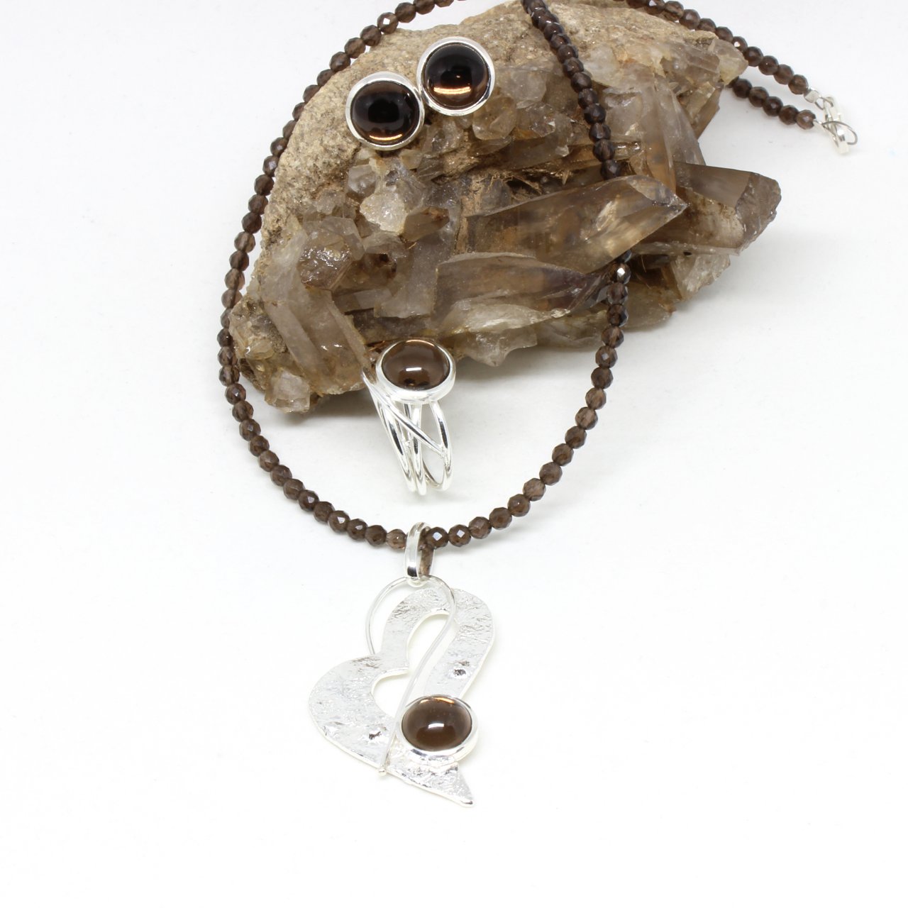 Dieses liebevoll gearbeitete Set aus 925 Sterlingsilber vereint Klassik und Moderne. Vor allem bei dem Herzanhänger wird das sehr deutlich, da die Form einen speziellen Eindruck erweckt bei dem man sofort erkennt das es keine Massenware ist. Dieses Schmuckset soll die Liebe die man beim schenken empfindet direkt an seinen Träger weitergeben. Mit der Besonderheit der Handwerkskunst wird es zusätzlich unterstrichen und man kann sofort erkennen das dieses Set etwas Kreatives ist. Veredelt haben wir es mit einem Rauchquarz der einen warmen Kontrast zu dem kühlen Sterlingsilber bildet.