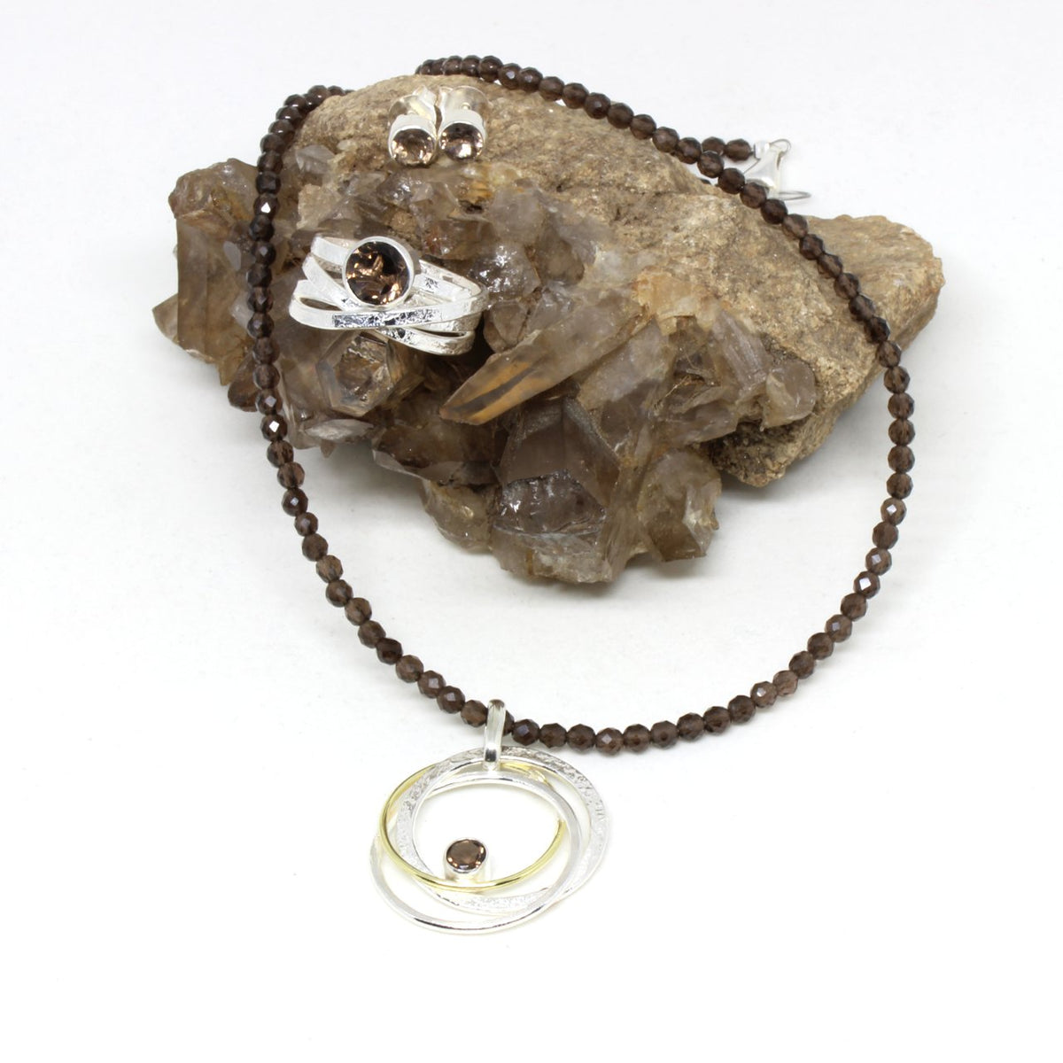 Ein Set zum verlieben! Die Harmonie der einzelnen Komponenten ist überzeugend. Die schöne Seidenmattstruktur ist eine besondere Form die Oberfläche zu behandeln und ein wahrer Blickfang. In den Anhänger haben wir einen 750 Gelbgolddraht eingearbeitet womit er an Hochwertigkeit und Eleganz gewinnt. Man kann ihn hervorragend in einer kurzen oder langen Kette tragen. Der Ring ist in der gleichen lockeren Optik hergestellt. Die einzelnen Schmuckstücke haben wir selbst aus 925 Sterlingsilber angefertigt. Das macht sie alle Einzigartig und Zeitlos.