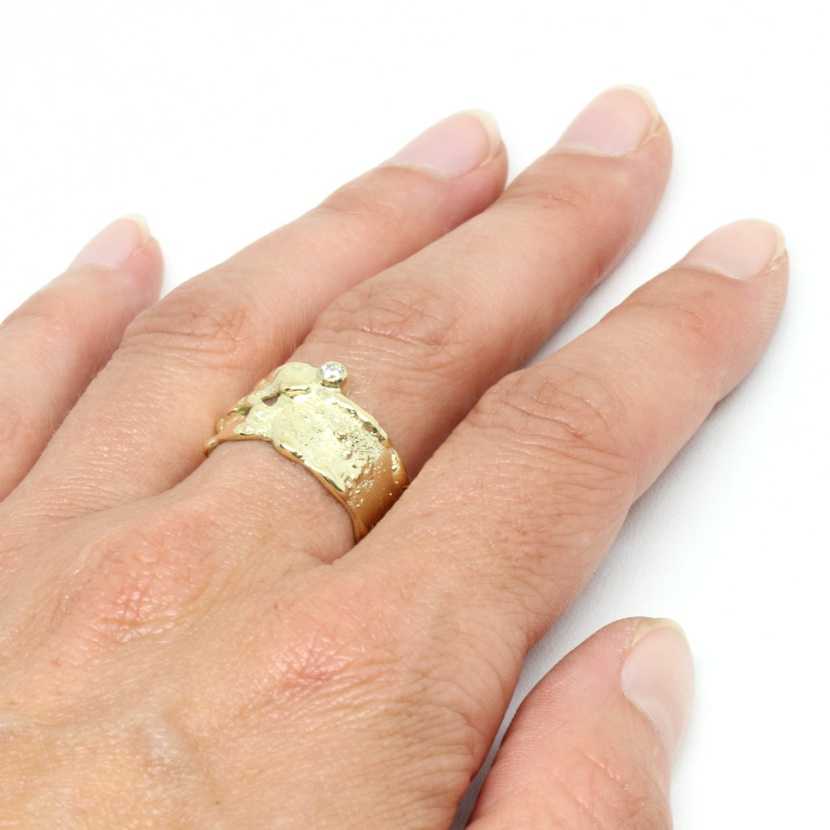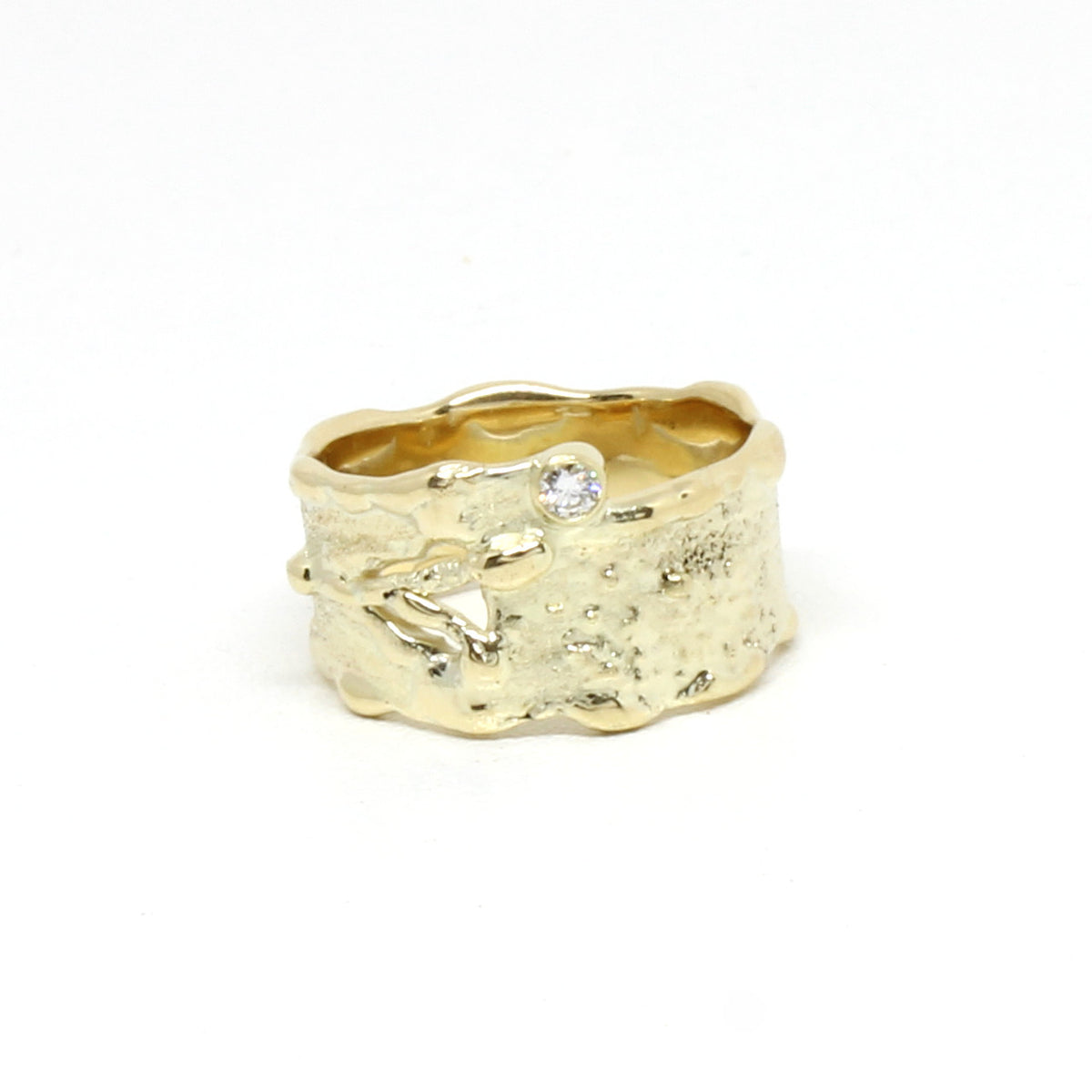 Dieser außergewöhnliche Ring entstand in unserer Werkstatt. Das von Meisterhand kreierte Schmuckstück ist aus hochwertigem 585er Gelbgold geschmiedet. Die facettenreiche Struktur verleiht dem Ring eine exclusive und einmalige Optik. Ein weiteres edles Element liefert der funkelnde Brillant. Jede Goldschmiedearbeit wird bei uns in allen Schritten von Hand hergestellt. Somit erhalten Sie wahre Unikate!