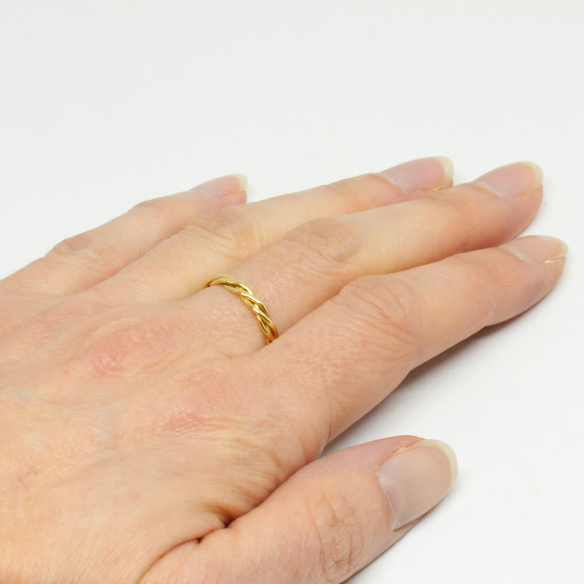 Diesen Ring haben wir aus 333er Gelbgold angefertigt. Es ist ein zeitloser Ring der an keltische Symbole erinnert. Das endlose Muster erscheint wie eine Zopftechnik und macht den Ring somit zu einem interessanten Schmuckstück. Dieses Model können Sie in den verschiedensten Varianten tragen. Unsere Kunden nehmen ihn gerne als Beisteckring zum Trauring, oder auch als Verlobungsring macht man mit diesem kreativen Schmuckstück vieles richtig. Abgesehen davon passt er perfekt zu Silberringen um Ihnen den Bicoloreffekt zu verleihen.