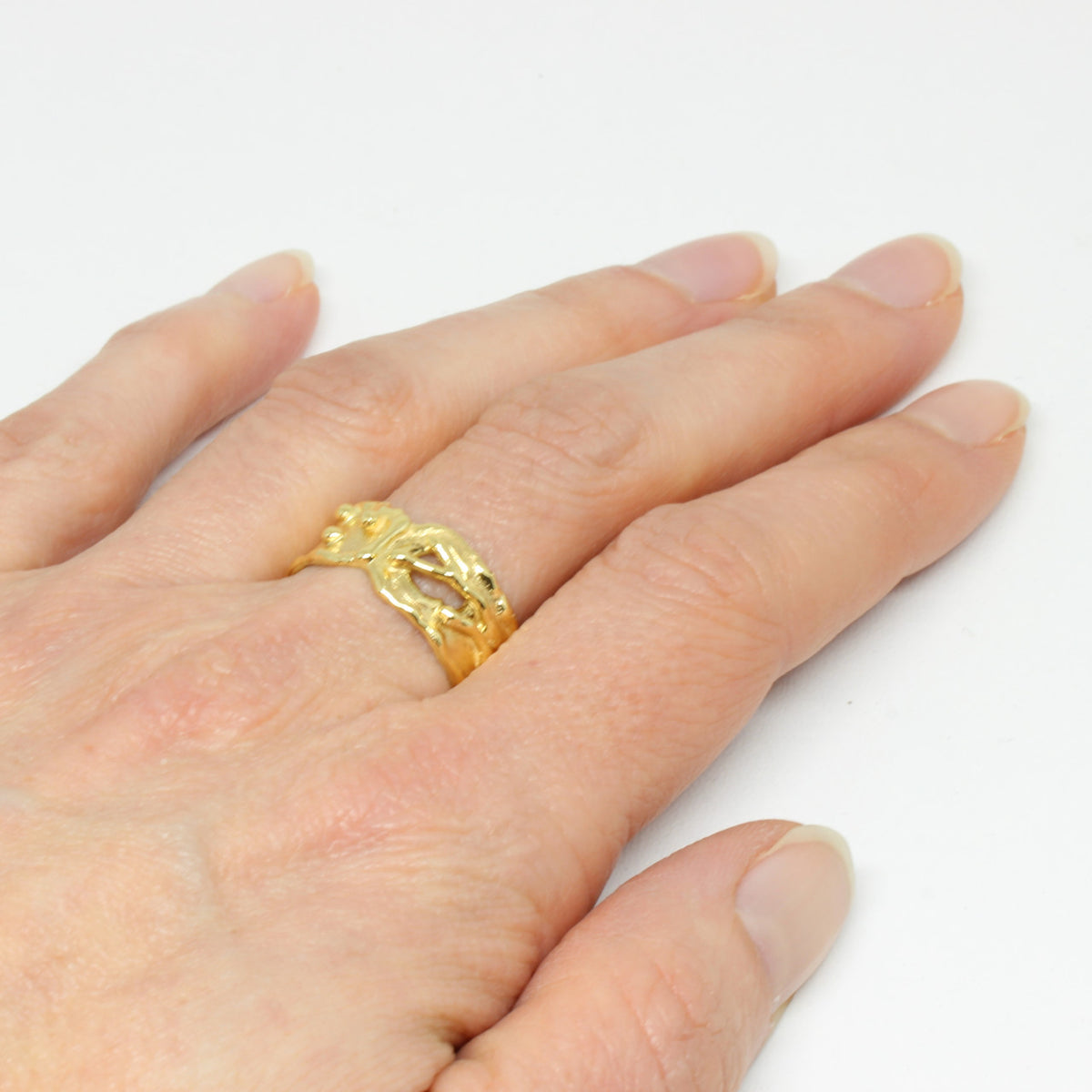 Diesen kreativen Goldring haben wir selbst angefertigt. Er wurde in unserer Werkstatt aus 333er Gelbgold hergestellt. Seine Einzigartige Bearbeitungsart macht ihn zu einem besonderen Einzelstück. Man erkennt sofort das dieses Schmuckstück echte Goldschmiedearbeit ist und nicht von der Stange kommt.