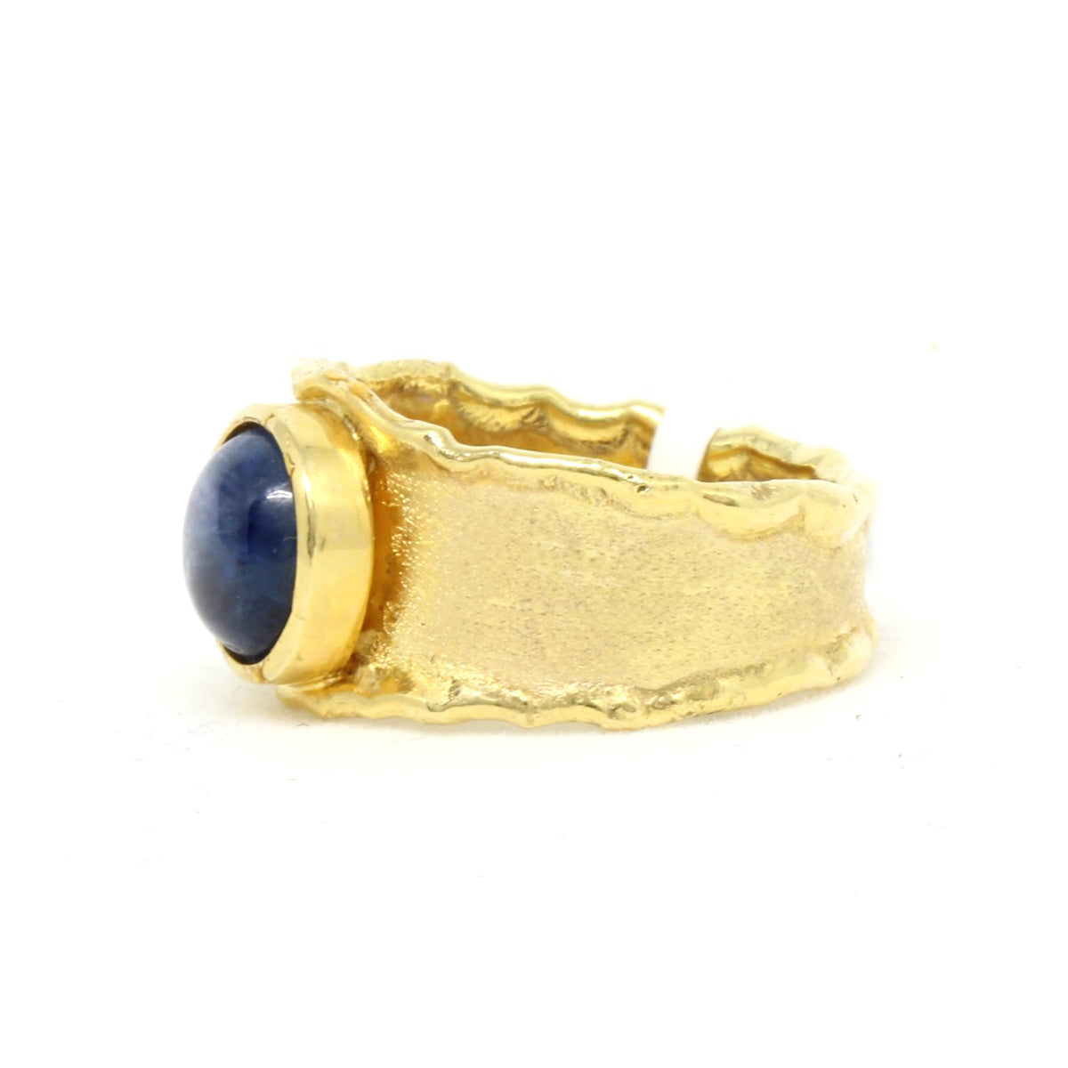 Diesen ansprechenden Goldring haben wir selbst kreiert und angefertigt. Er wurde in unserer Werkstatt aus 333er Gelbgold hergestellt. Seine Einzigartige Bearbeitungsart macht ihn zu einem echten Unikat. Man erkennt sofort das dieses Schmuckstück keine Massenware, sondern echte Goldschmiedearbeit ist. Als auffälligen Akzent haben wir einen strahlend, blauen Disthen eingearbeitet.