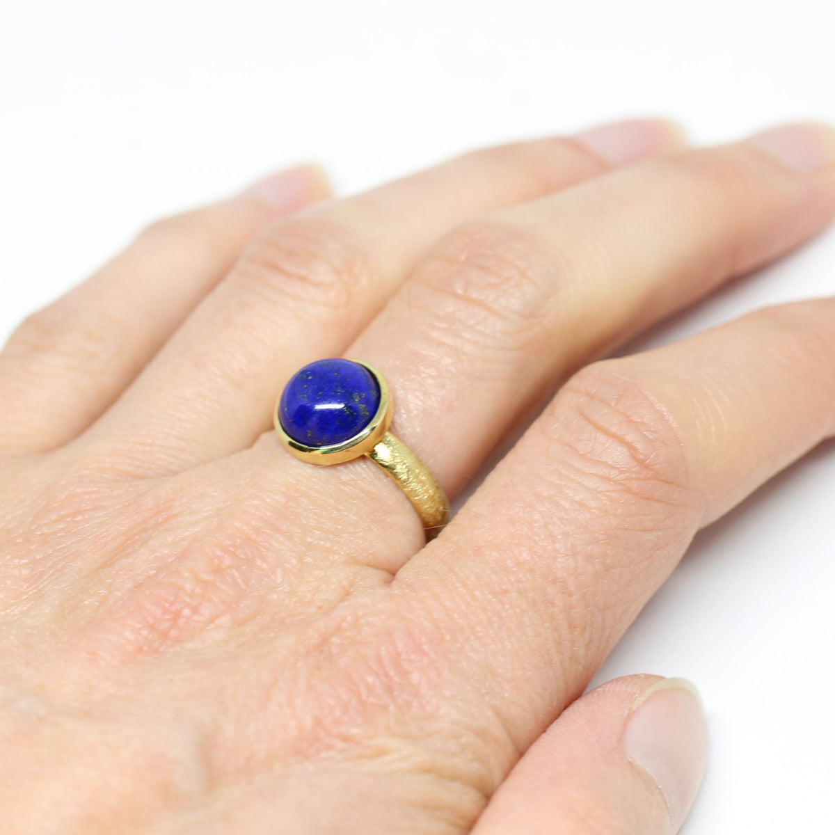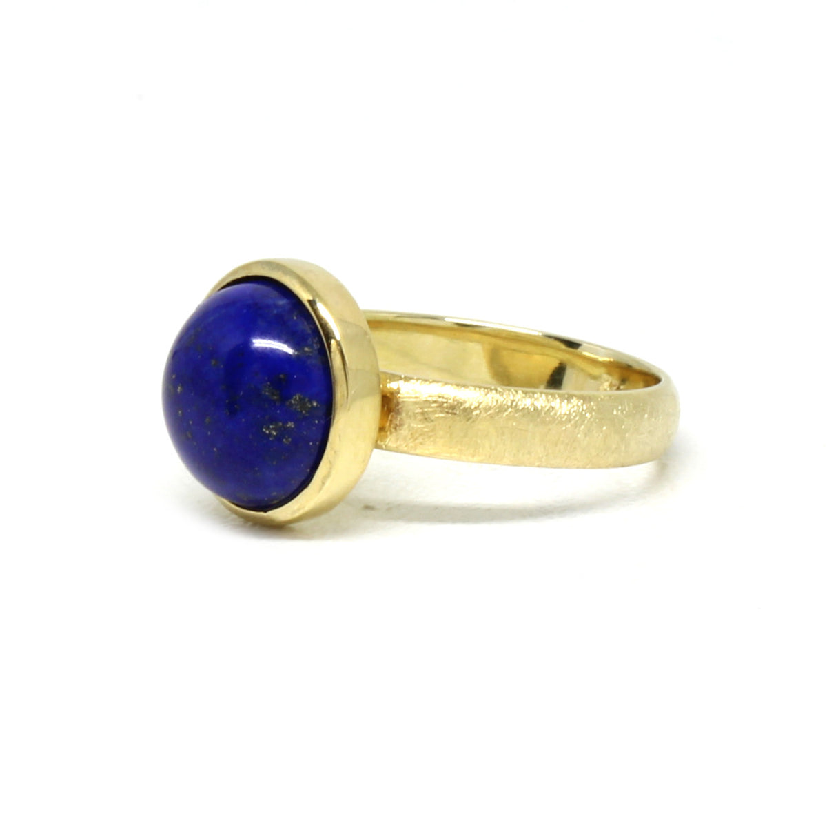 Ein bezauberndes und massiv hergestelltes Schmuckstück bekommen Sie mit diesem tollen Goldring. Wir haben ihn in unserer Werkstatt aus 333er Gelbgold hergestellt. Den Mittelpunkt liefert eindeutig der königblaue Lapislazuli. Dieser harmoniert perfekt mit dem warmen Goldton. Den Ring selbst haben wir eismattiert um dem Schmuckstück weitere Eleganz zu zaubern.