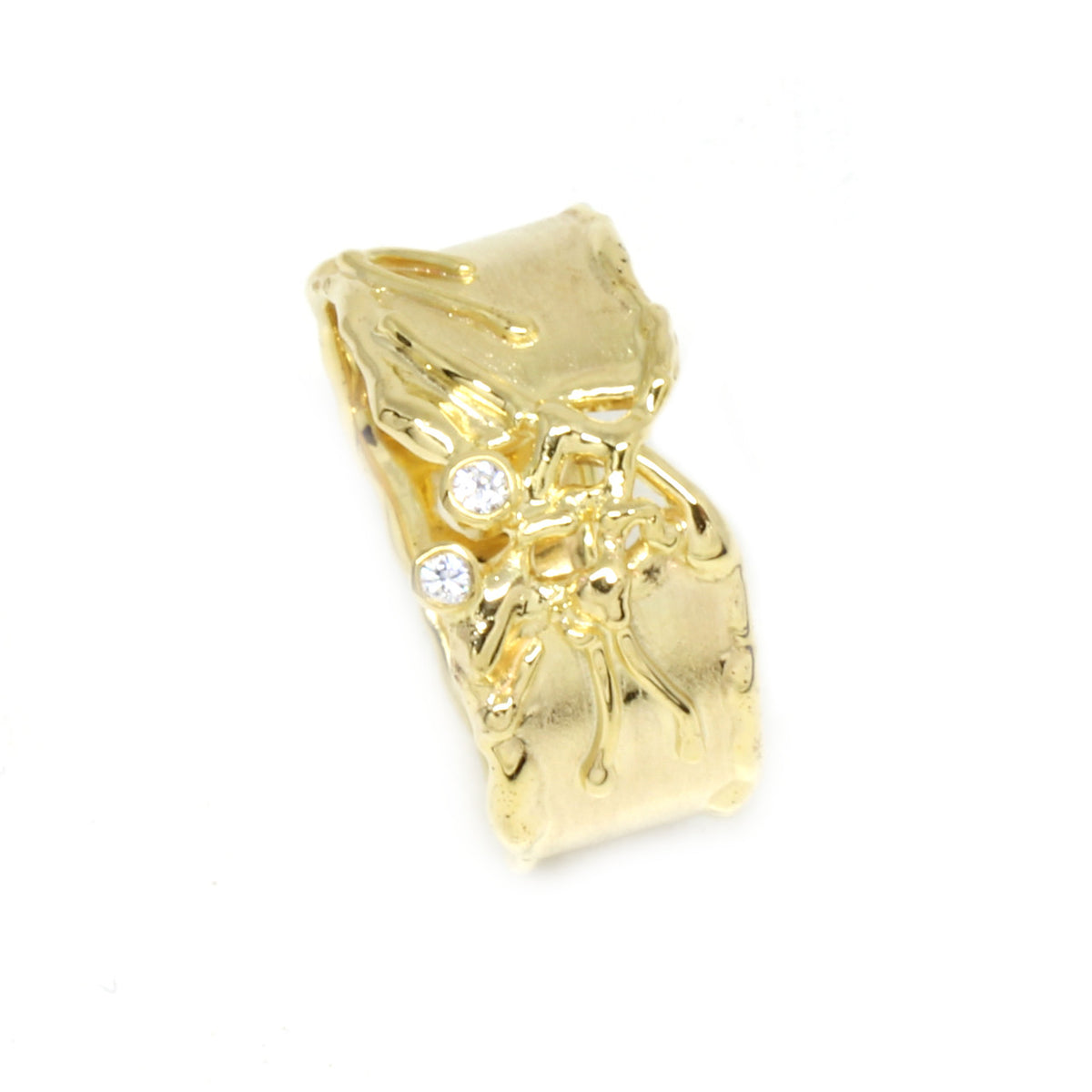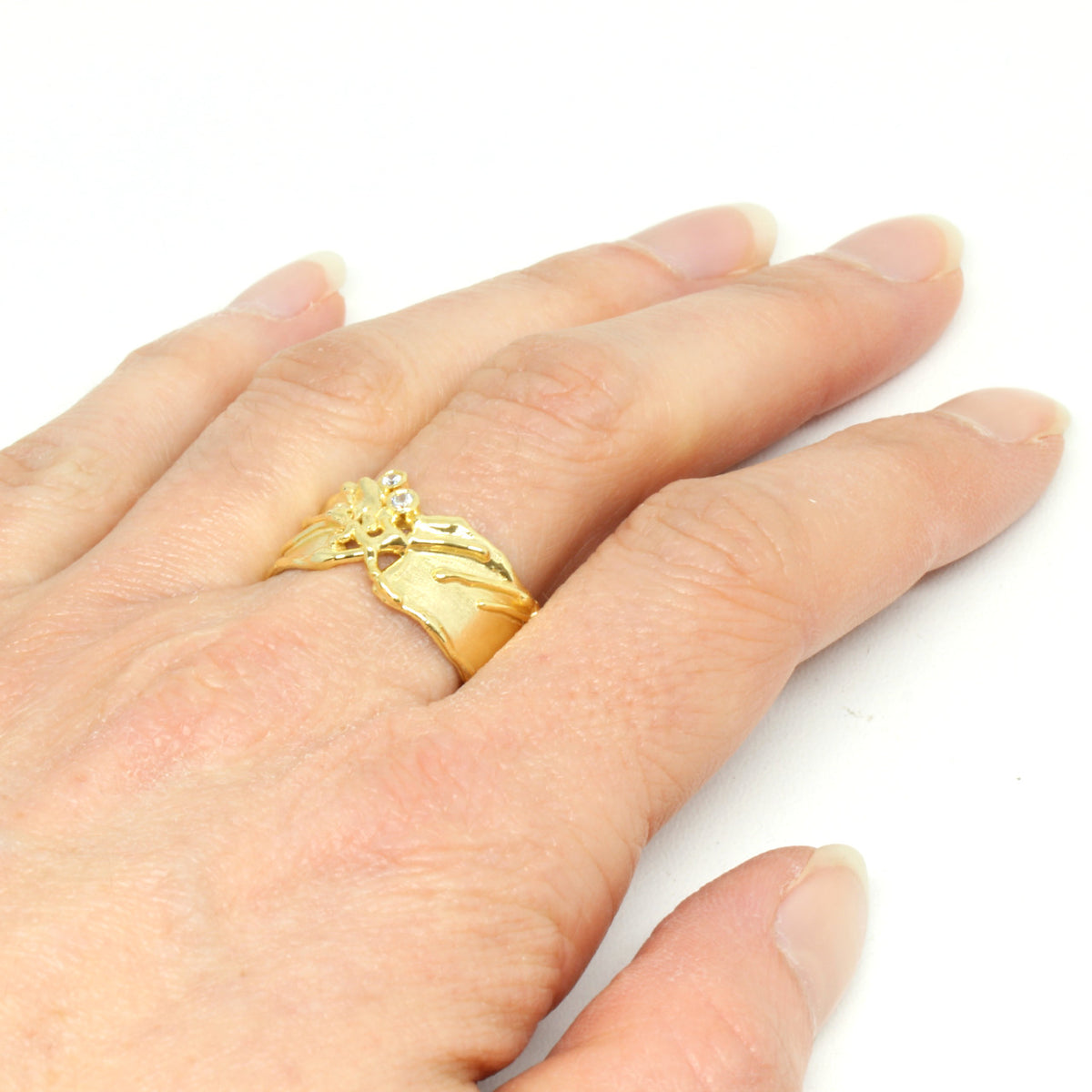 Diesen ansprechenden Goldring haben wir selbst kreiert und angefertigt. Er wurde in unserer Werkstatt aus 333er Gelbgold hergestellt. Seine Einzigartige Bearbeitungsart macht ihn zu einem echten Unikat. Man erkennt sofort das dieses Schmuckstück keine Massenware, sondern echte Goldschmiedearbeit ist. Als kleinen Akzent haben wir zwei kleine Zirkonia eingearbeitet.