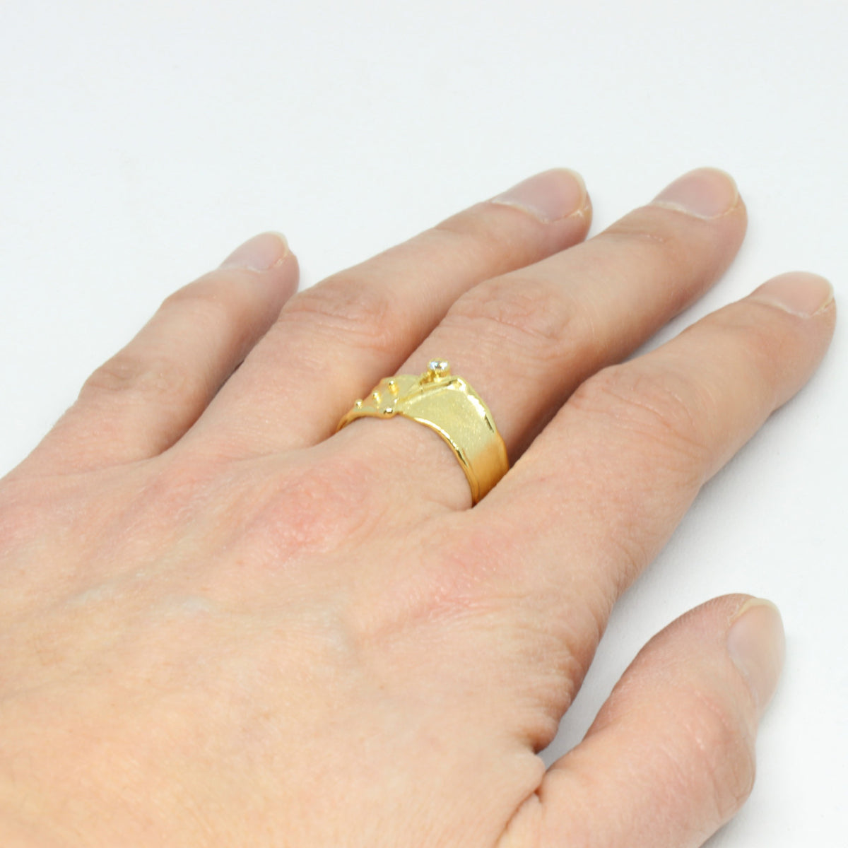 Diesen ansprechenden Goldring haben wir selbst kreiert und angefertigt. Er wurde in unserer Werkstatt aus 333er Gelbgold hergestellt. Seine Einzigartige Bearbeitungsart macht ihn zu einem echten Unikat. Man erkennt sofort das dieses Schmuckstück keine Massenware, sondern echte Goldschmiedearbeit ist. Als kleinen Akzent haben wir einen Zirkonia eingearbeitet.
