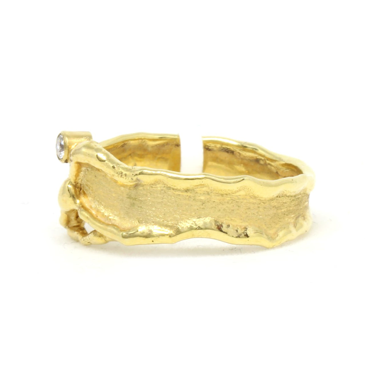 Diesen kreativen Goldring haben wir selbst angefertigt. Er wurde in unserer Werkstatt aus 333er Gelbgold hergestellt. Seine Einzigartige Bearbeitungsart macht ihn zu einem besonderen Einzelstück. Man erkennt sofort das dieses Schmuckstück echte Goldschmiedearbeit ist. Als kleinen Akzent haben wir einen Zirkonia eingearbeitet.