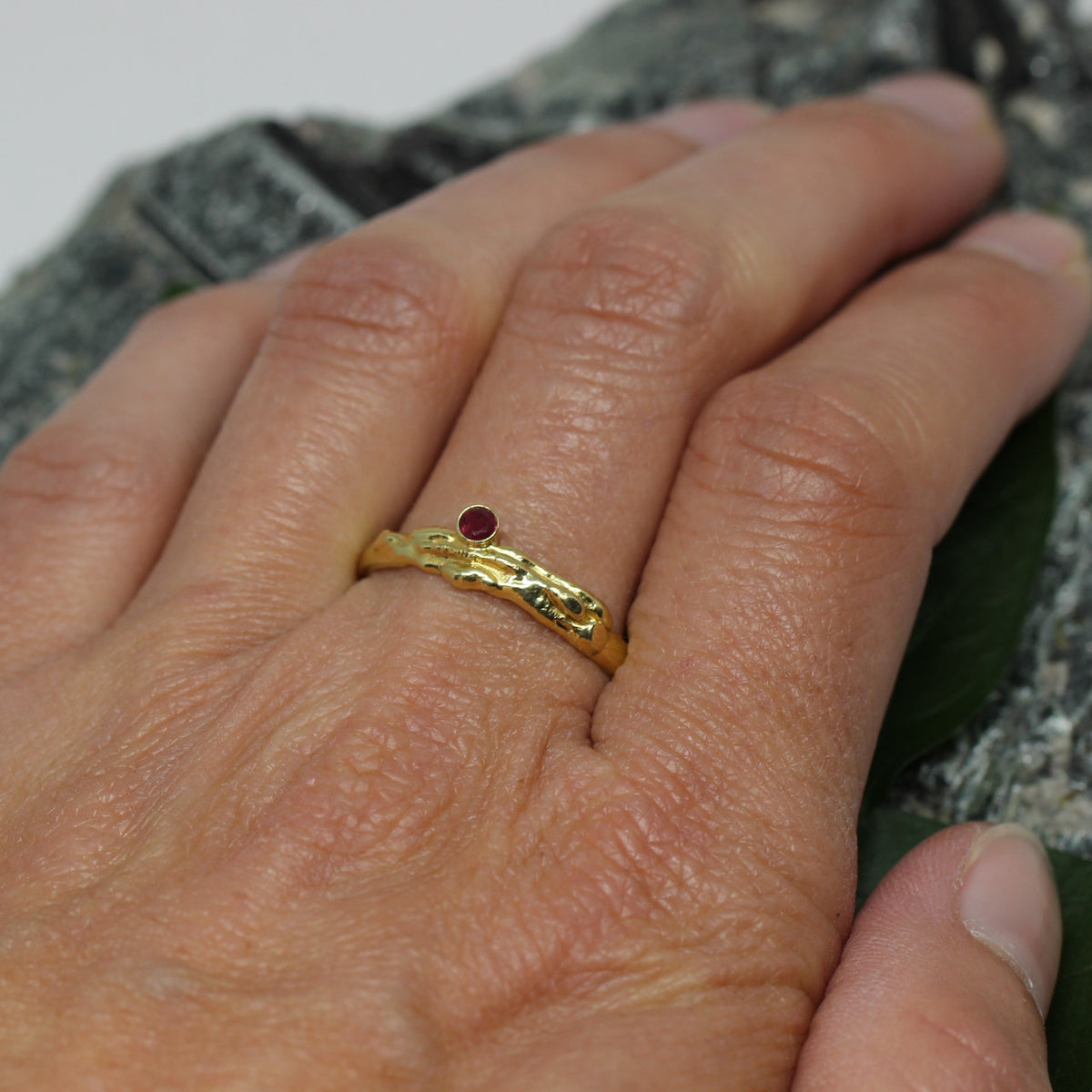 Dieses schöne Schmuckstück stammt ursprünglich aus unserer Werkstatt. Der Ring ist aus 585er Gelbgold geschmiedet und mit einem Rubin versehen.