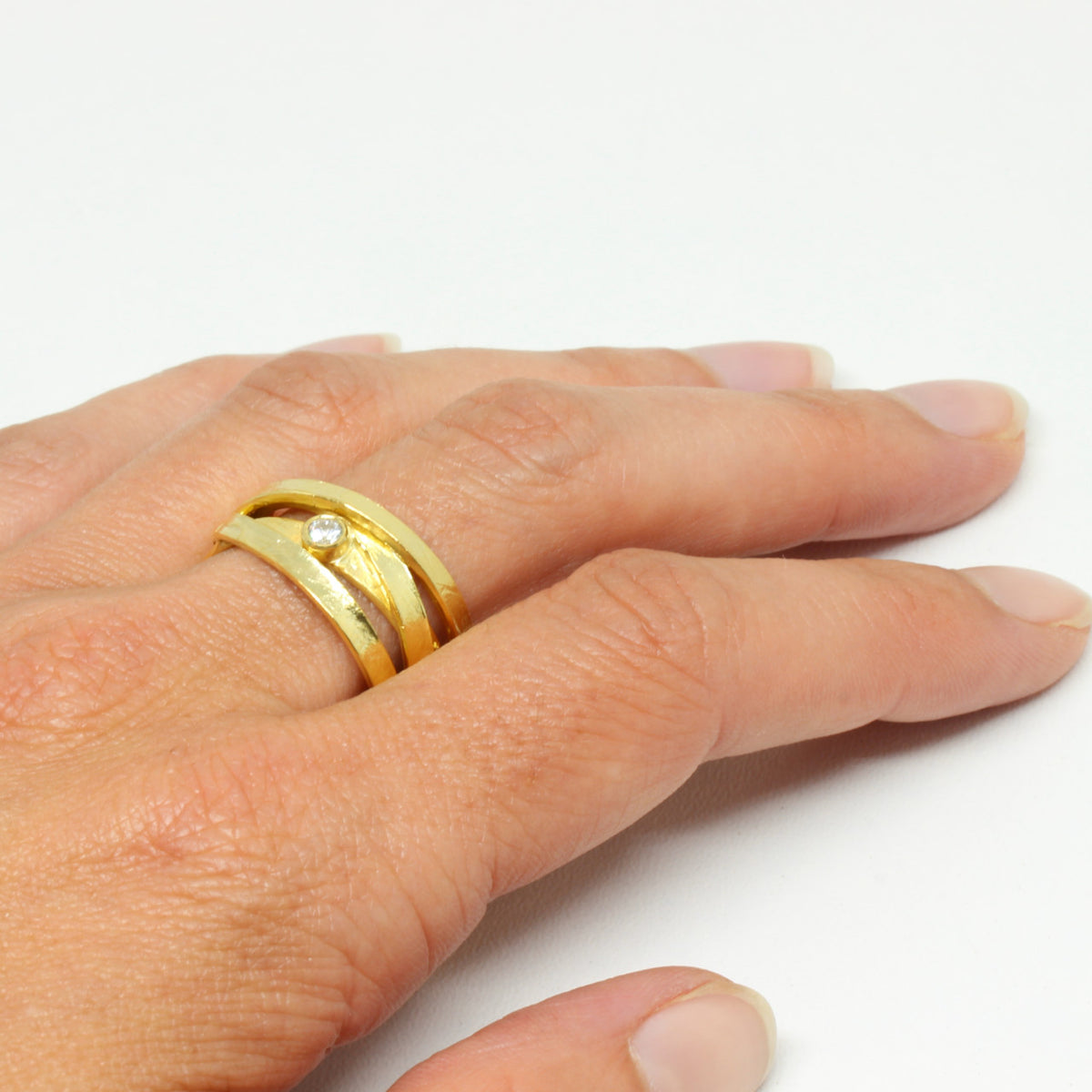 Diesen ansprechenden Goldring haben wir selbst kreiert und angefertigt. Er wurde in unserer Werkstatt aus 333er Gelbgold hergestellt. Seine Einzigartige Bearbeitungsart macht ihn zu einem echten Unikat. Man erkennt sofort das dieses Schmuckstück keine Massenware, sondern echte Goldschmiedearbeit ist. Als kleinen Akzent haben wir einen kleinen Zirkonia eingearbeitet.