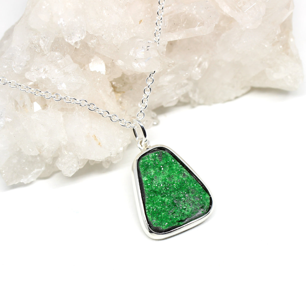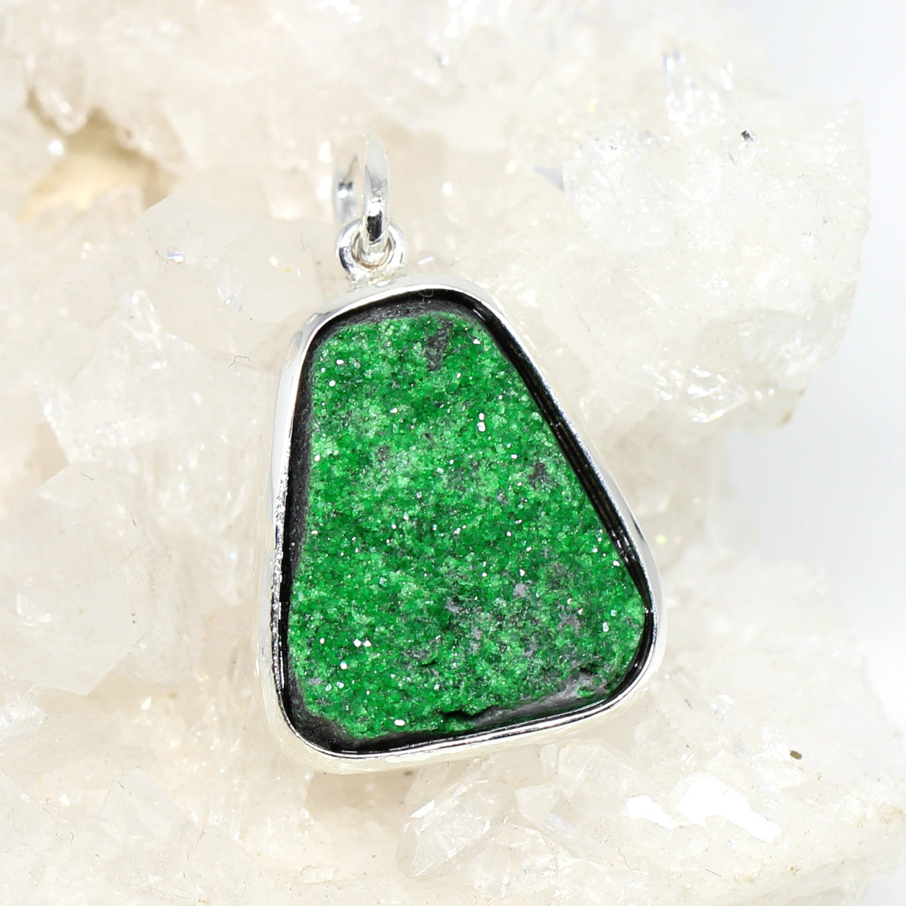 Schöner Anhänger aus 925er Sterlingsilber. Die Verbindung mit dem strahlenden Uwarowit und der schlichten Fassung machen dieses Schmuckstück zu einem echten Blickfang. Egal ob in einer kurzen Silberkette oder einer Kautschukkette, du liegst mit diesem Schmuckstück absolut im Trend!