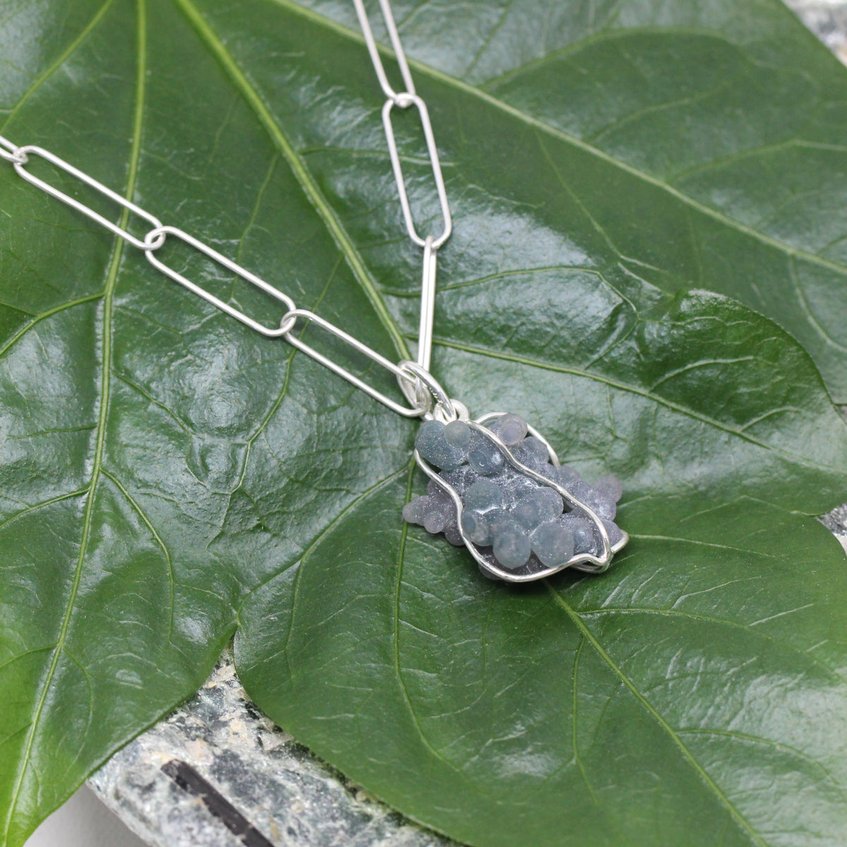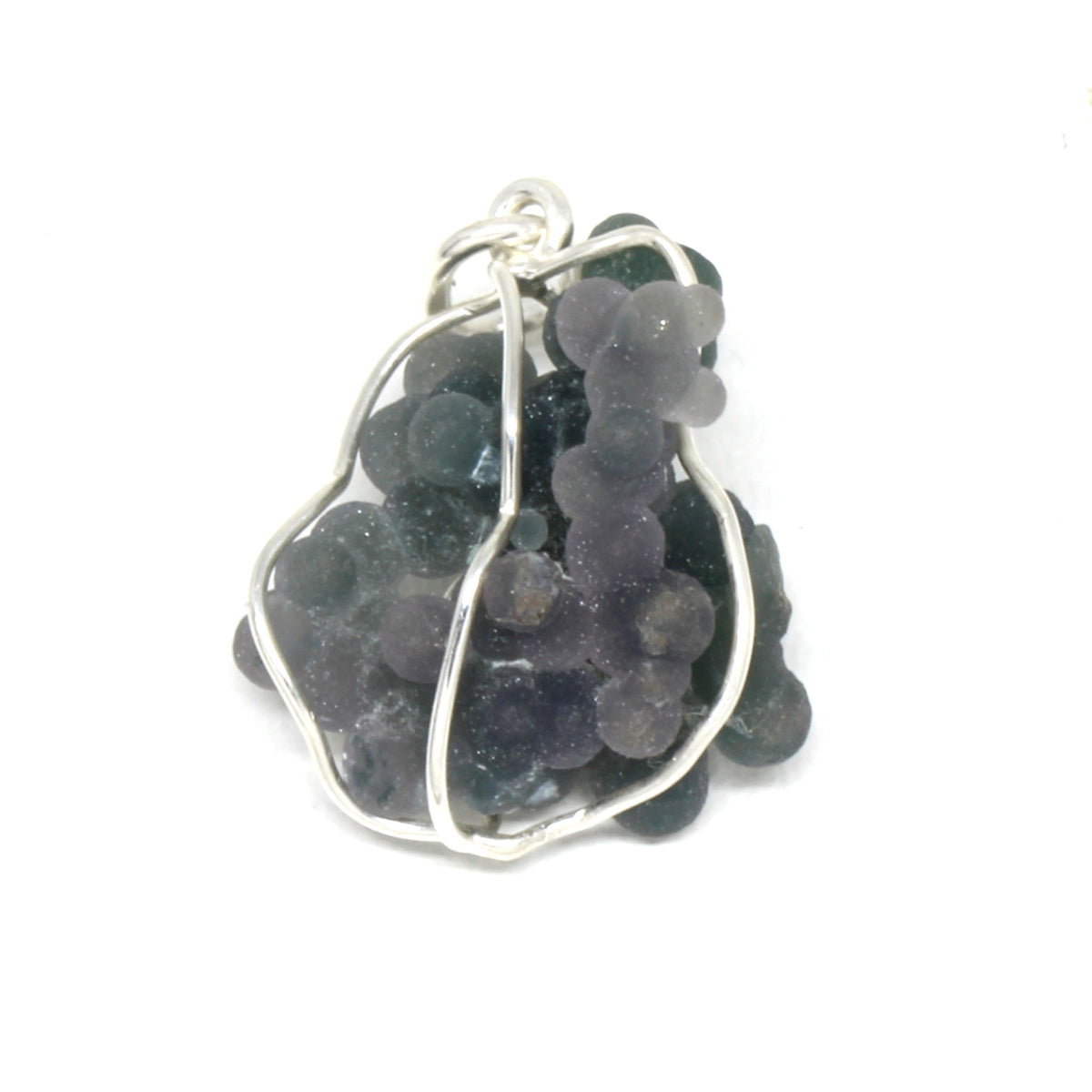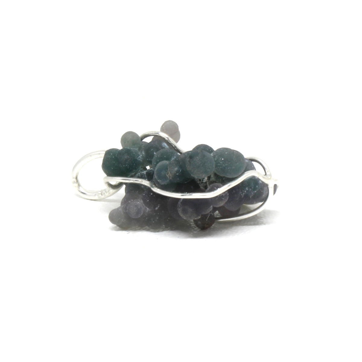 Du liebst Natursteine in unbehandelter Form? Dann ist dieser zauberhafte Chalcedonanhänger genau das Richtige. Er erinnert mit seinen kleinen Kugeln an ein Traubenbündel. Der Edelstein ist nicht geschliffen, sondern lediglich in eine 925er Sterlingsilber Einfassung gewickelt. Der lila, grüne Chalcedon kann somit ideal seine Eigenschaften verbreiten. Ihm werden die Sternzeichen Krebs, Zwilling und Schütze zugeordnet.