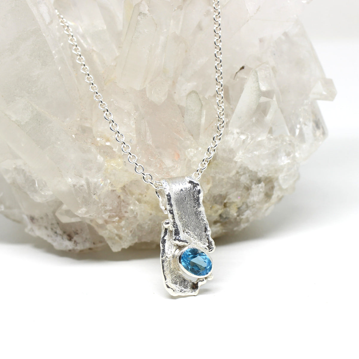 Ein Schmuckstück der Extraklasse bekommst du mit diesem traumhaften Silberanhänger! Er ist von unseren Goldschmieden aus 925er Sterlingsilber hergestellt. Das Highlight ist in diesem Fall der einzigartige Blautopas. Die Aufhängung des Anhängers haben wir unserer Handwerkskunst angepasst und etwas extravagantes hergestellt. Alles in allem bekommst du hier ein fabelhaftes Unikat aus Meisterhand geschmiedet.