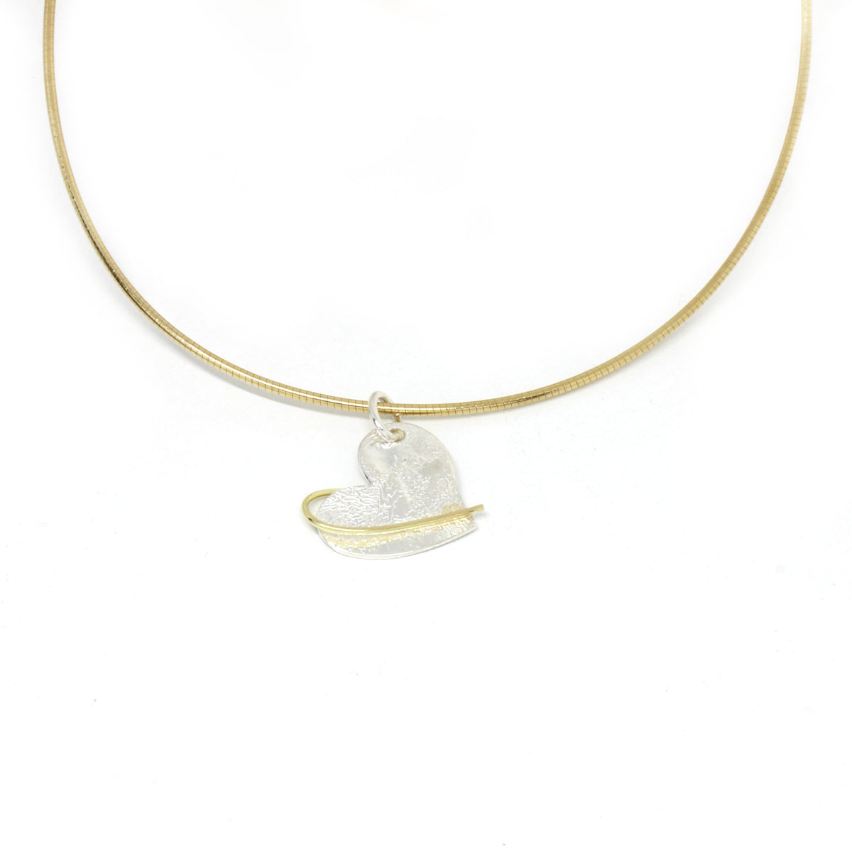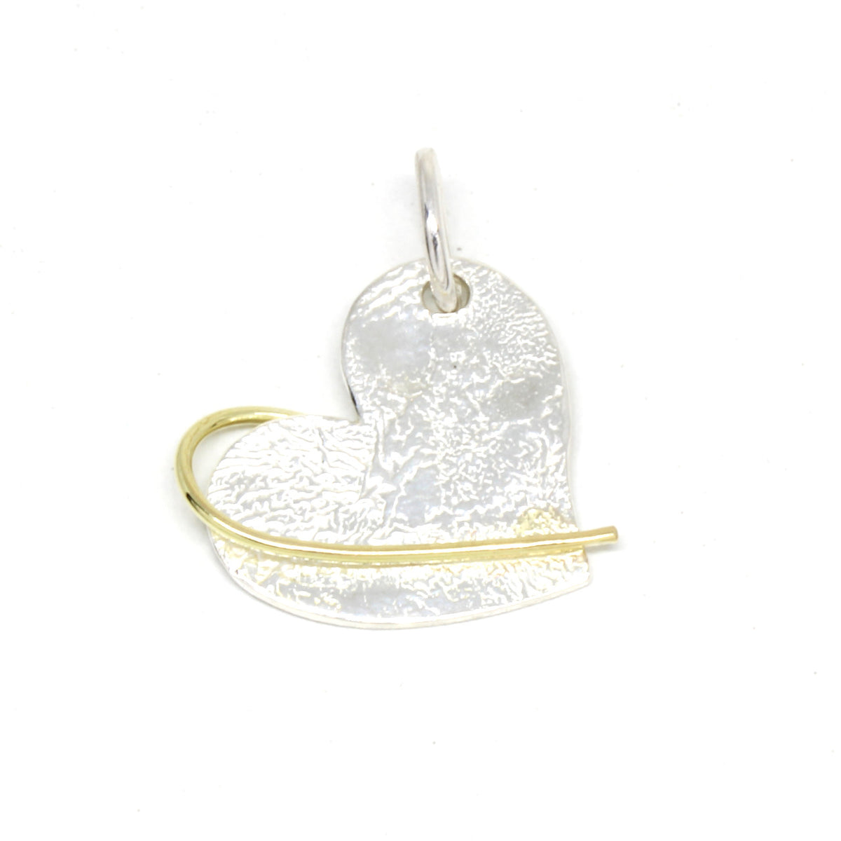 Sie mögen Herzformen allerdings nicht den Standardtyp? Dann ist dieses Handgefertigte Herz aus 925er Sterlingsilber genau das richtige für Sie. Die besondere Form und die individuelle Oberflächenbearbeitung machen den Anhänger zu einem tollen Schmuckstück, das in jedem Fall ein super kreatives Geschenk ist. Als besonderen Effekt haben wir einen schmalen Bogen aus 750er Gelbgold eingearbeitet. Somit kann man den Anhänger auch wunderbar zu Goldschmuck kombinieren.