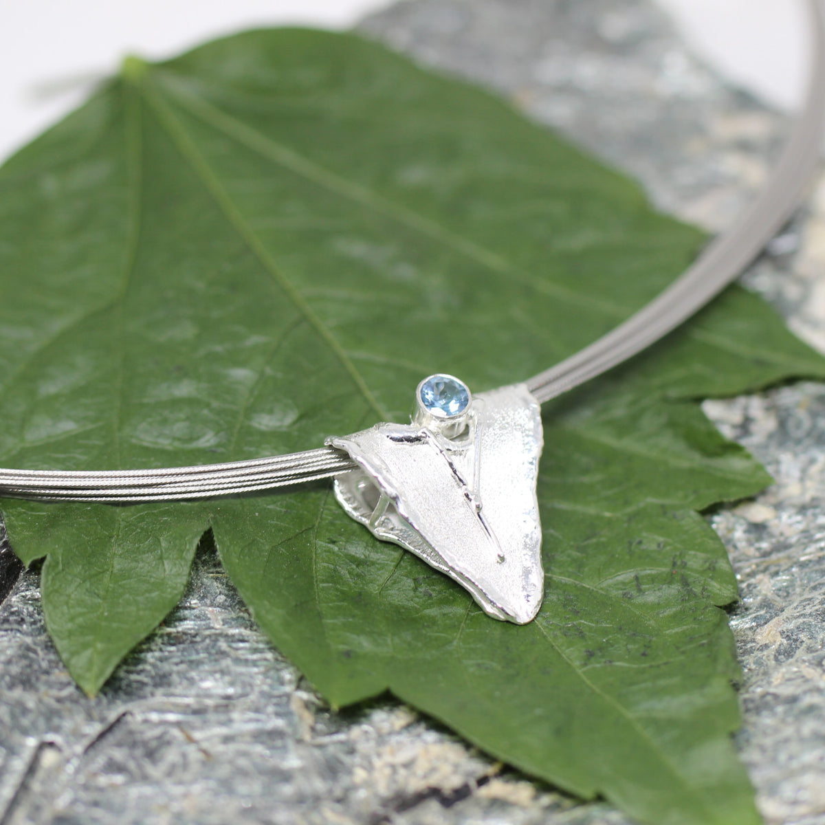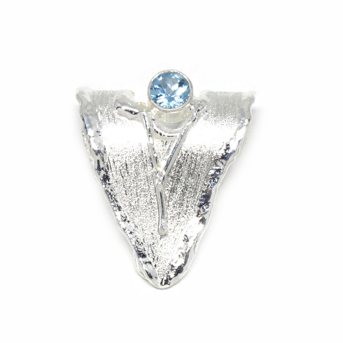 Dieses Schmuckstück wirkt in erster Linie durch seine handwerkliche Verarbeitung. Auf den zweiten Blick fällt einem direkt der eisblaue Aquamarin ins Auge. Der kühle Farbton des Edelsteines vereint mit dem 925er Sterlingsilber macht den Anhänger zu einem edlen Einzelstück.
