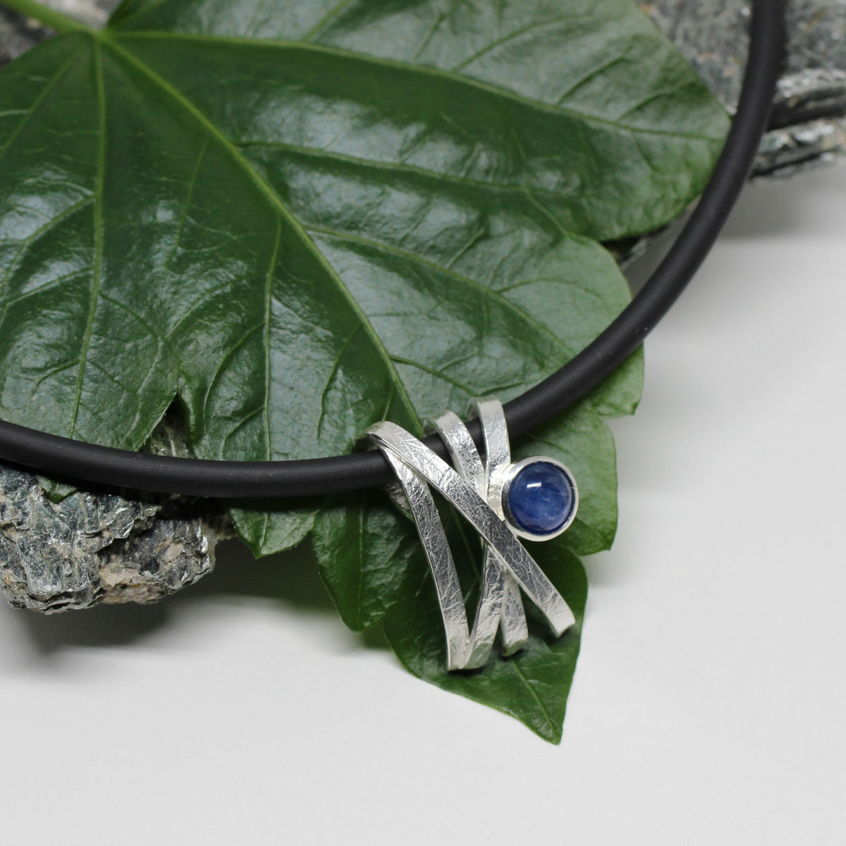 Schöner Anhänger aus 925er Sterlingsilber mit Disthen. Dieses besondere Schmuckstück ist selbst entworfen und in unserer kleinen Goldschmiede hergestellt. Mit viel Liebe zum Detail und einem bezaubernden Schmuckstein ist ein Stück entstanden das sich besonders gut zu Jeanskleidung tragen lässt. Der Disthen ist ein in verschiedenen Blauschattierungen schimmernder Halbedelstein. Kombiniert mit dem Sterlingsilber ist dies ein wundervolles Schmuckstück das man zu jedem Anlass super tragen kann.