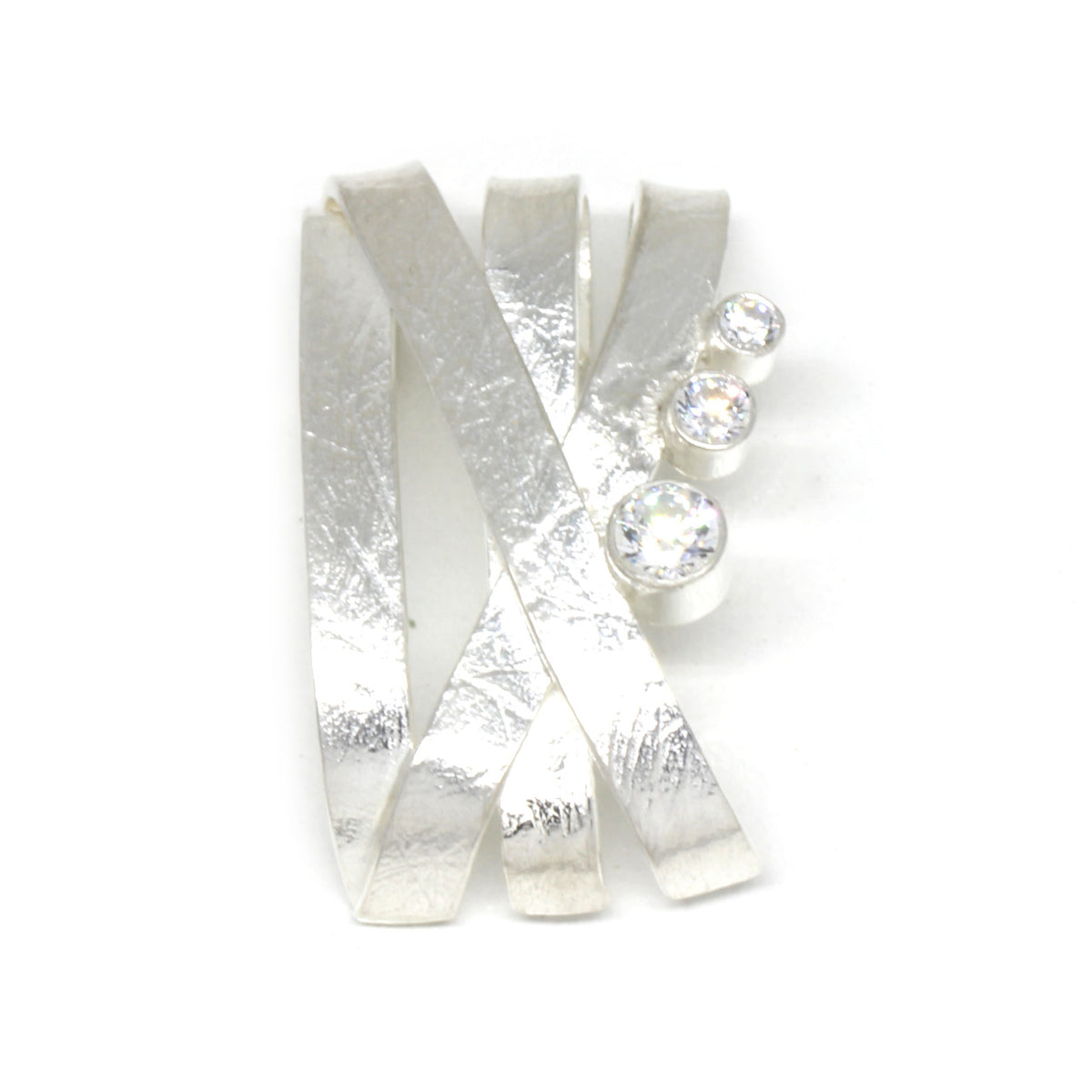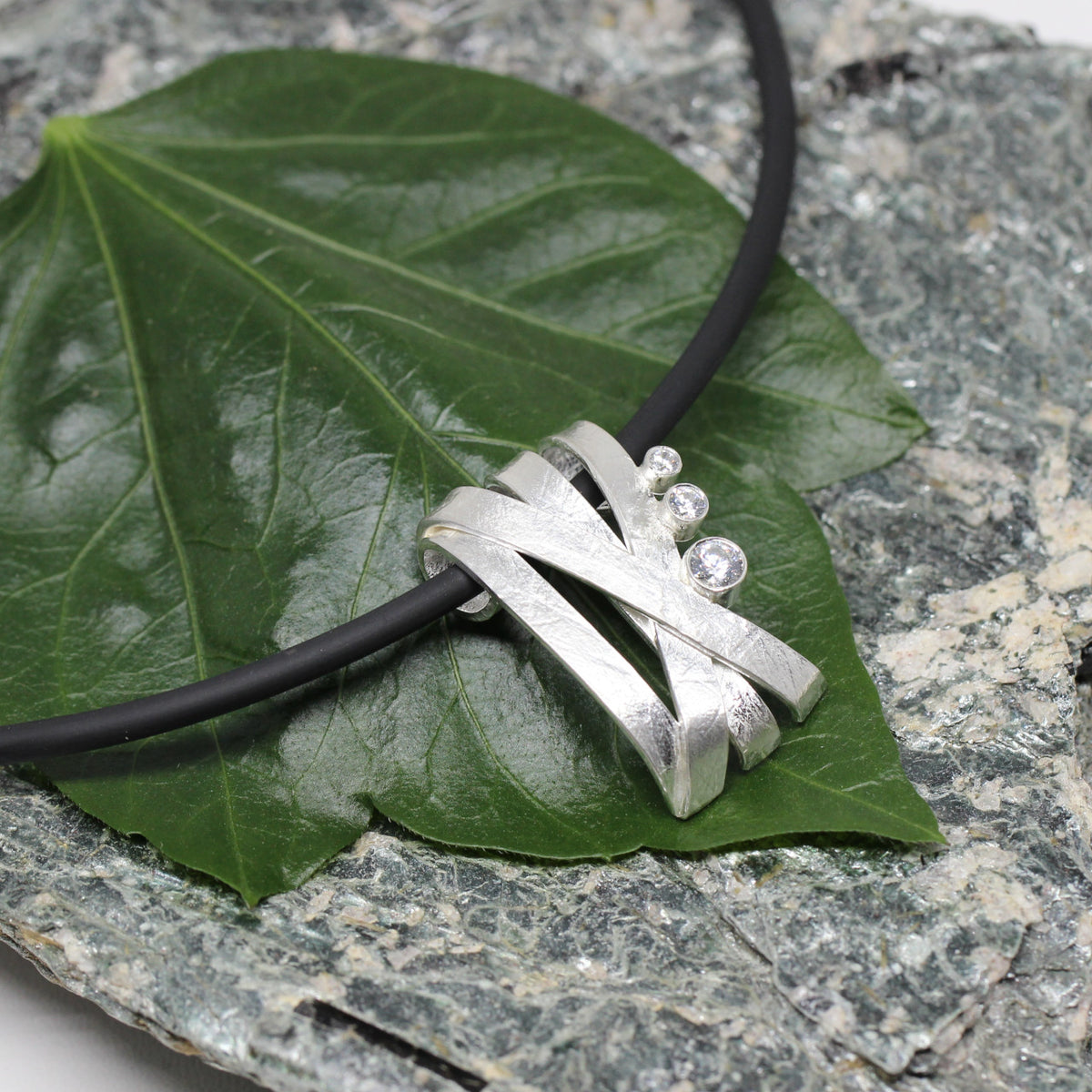 Dieser moderne Anhänger aus 925er Sterlingsilber ist neu in unserem Sortiment. Er vervollständigt das Set zu den Ohrringen SWD14272 und unseren beliebten Wickelringen. Wir haben das Schmuckstück in unserer kleinen Manufaktur hergestellt und mit drei funkelnden Zirkonia abgerundet. Die sportliche Oberflächenstruktur passt sehr gut in eine Kautschukkette.