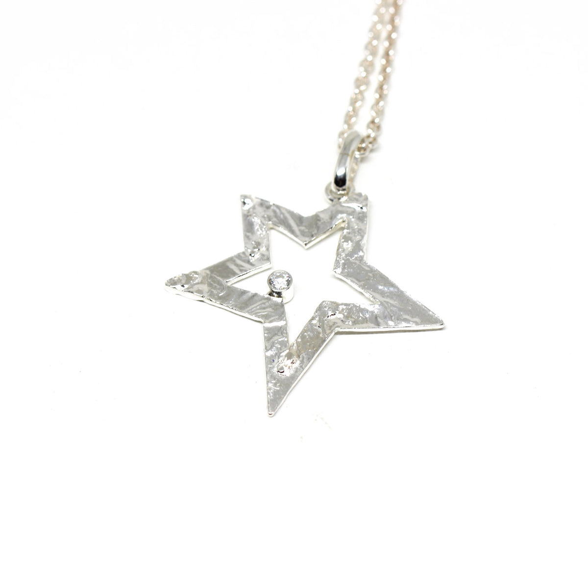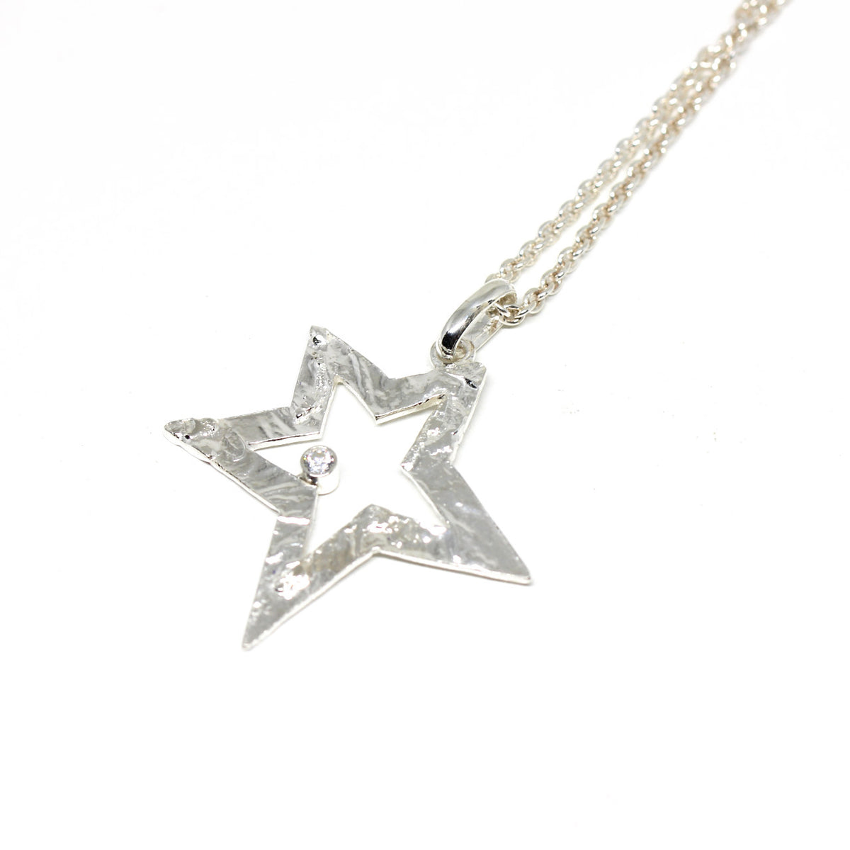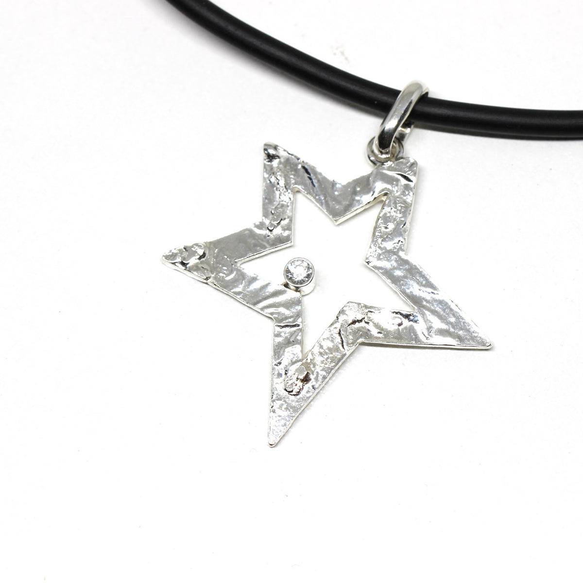 Sie lieben Sterne? Dann ist dieser handgefertigte Stern aus 925er Sterlingsilber genau das richtige für Sie. Die besondere Form und die individuelle Oberflächenbearbeitung machen den Anhänger zu einem tollen Schmuckstück. Der facettierte Zirkonia lässt den Stern leuchten und funkeln.