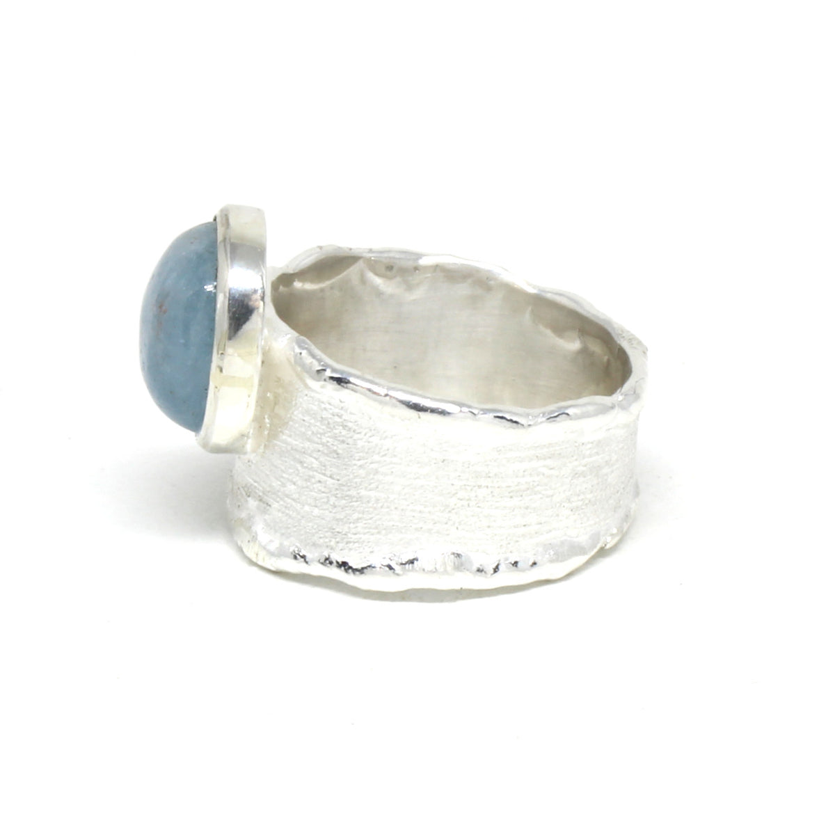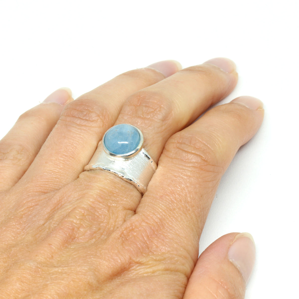 Toller Ring aus 925er Sterlingsilber der in unserer Werkstatt hergestellt wurde. Den Mittelpunkt schmückt ein Aquamarinstein. Wie der Name des Steines schon verrät erinnert die Farbe an Wasser. Vor allem zu dem Silber sieht der Aquamarin sehr edel aus. Ein weiterer Blickfang ist die schöne Struktur die wir in das Metall eingearbeitet haben. Dadurch bekommt dieses Stück noch mehr Kreativität.