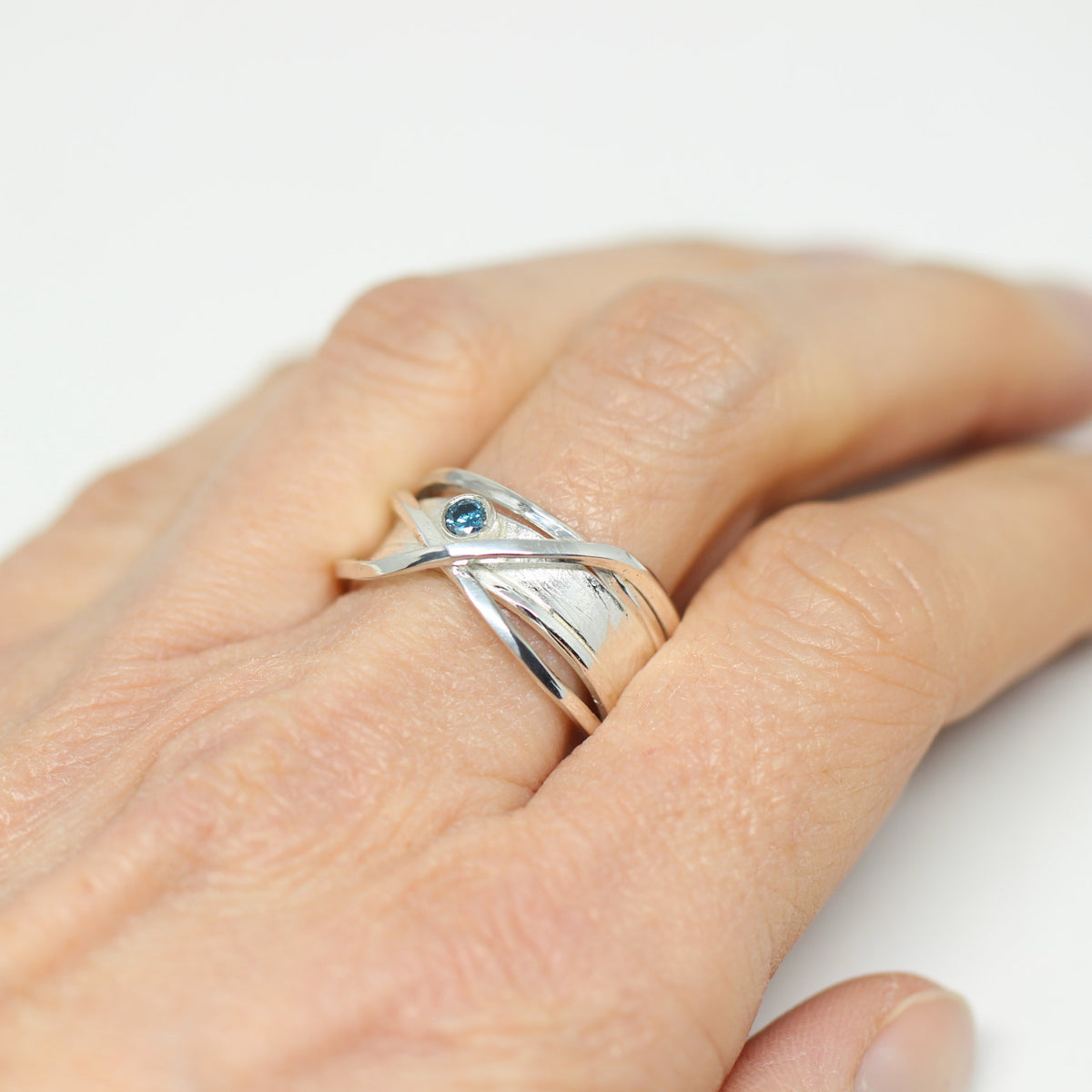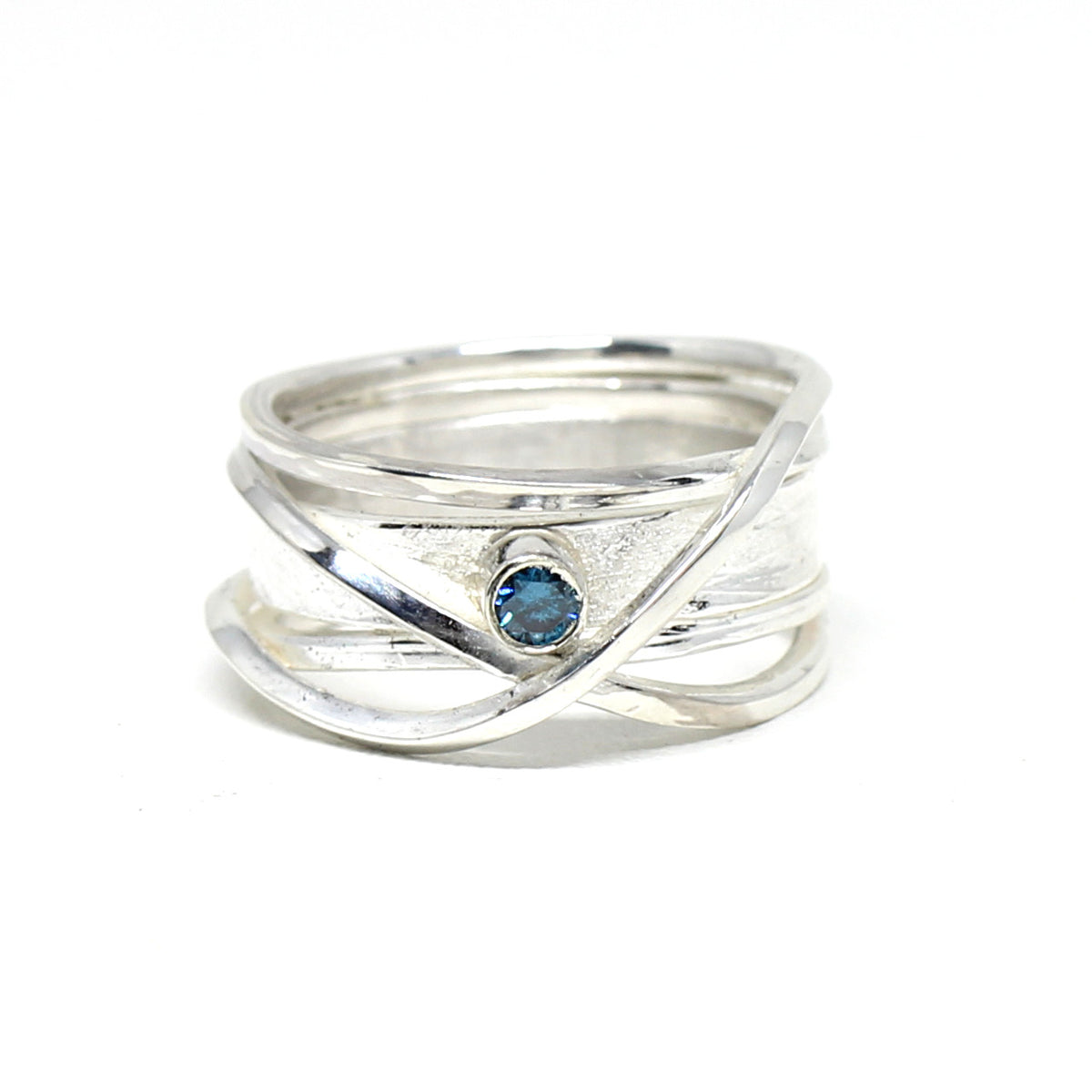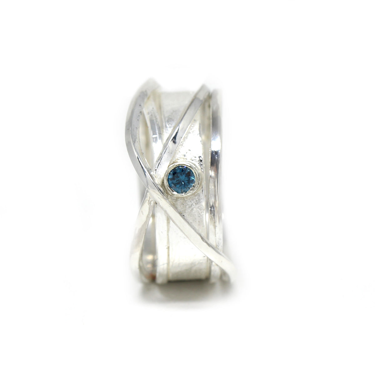 Ein Schmuckstück der besonderen Art. Dieser handgefertigte 925er Silberring trägt seinen Reiz in der Mitte. Er wird genau an dieser Stelle von einem strahlenden blauen Diamant ( behandelt) geschmückt. Der grandiose meerblaue Stein zieht einen sofort in seinen magischen Bann. Eingebettet ist der Diamant in polierte Silberfäden die das funkeln des Steines hervorheben. Die Basis des Ringes bildet eine Ringschiene die mit unserer speziellen Technik bearbeitet ist. Alles zusammen vereint, bildet es ein verführerisches und kreatives Schmuckstück das man mit Freude tragen wird.