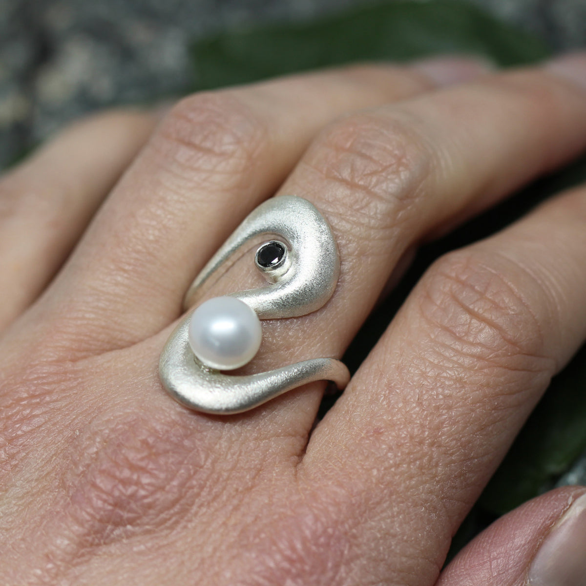 Diesen stylischen Ring haben wir in unserer kleinen Manufaktur hergestellt. Das Schmuckstück ist aus 925er Sterlingsilber geschmiedet und die Oberfläche mattiert. Als Besonderheit haben wir einen schwarzen Diamanten und eine Süßwasserperle eingefügt. Diese Komponenten erzielen einen tollen Kontrast zu dem Sterlingsilber.