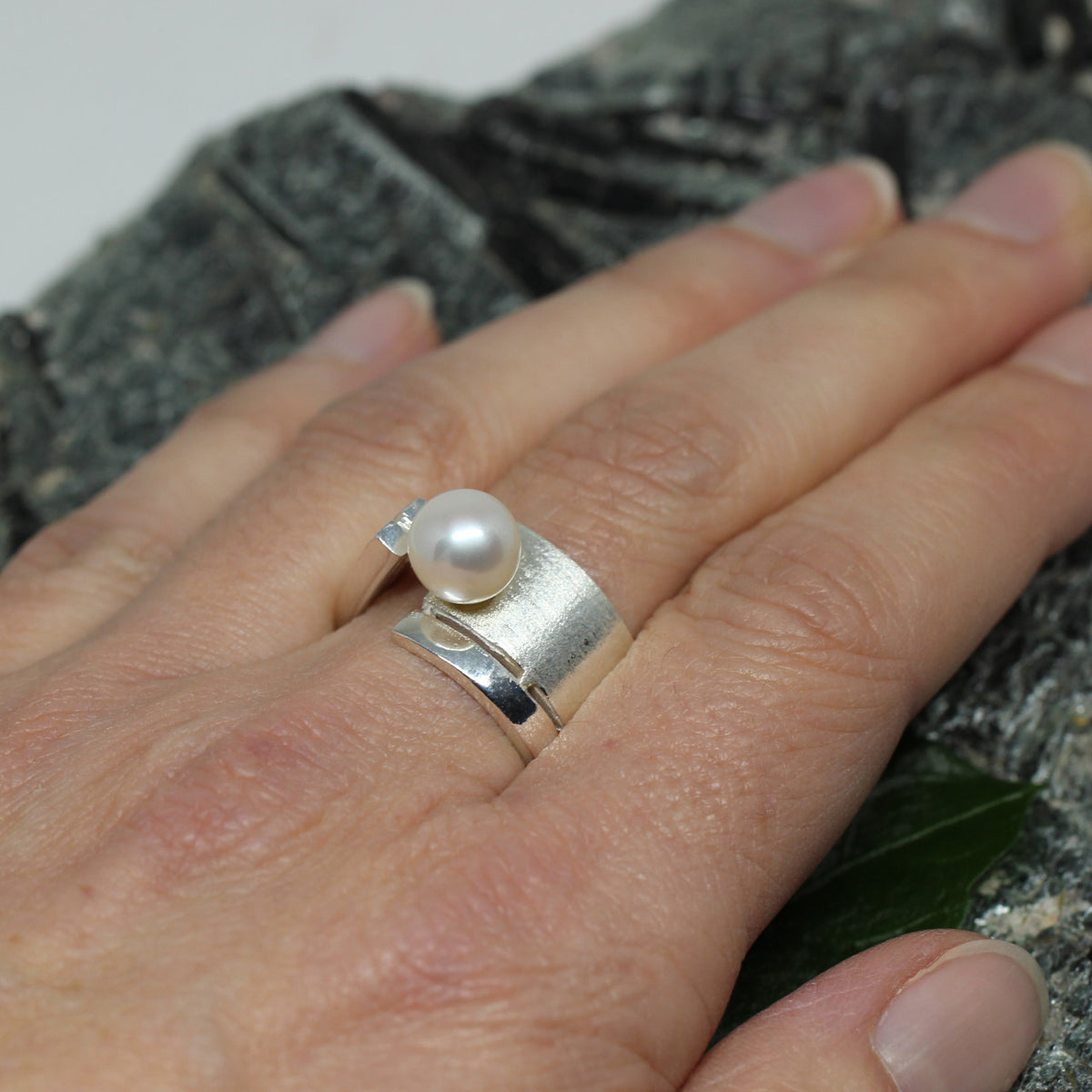 Diesen stylischen Ring haben wir in unserer kleinen Manufaktur hergestellt. Das Schmuckstück ist aus 925 Sterlingsilber geschmiedet und die Oberfläche mattiert und poliert. Als Besonderheit haben wir eine Süßwasserperle eingefügt. Dieses Schmuckstück ist der ideale Begleiter durch den Alltag, da er sich zu jedem Outfit kombinieren lässt.