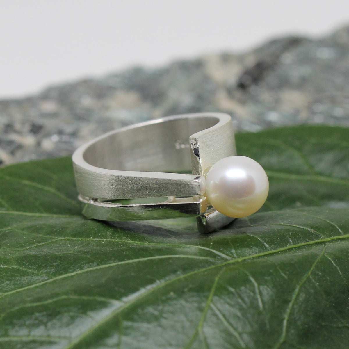 Diesen stylischen Ring haben wir in unserer kleinen Manufaktur hergestellt. Das Schmuckstück ist aus 925er Sterlingsilber geschmiedet und die Oberfläche mattiert und poliert. Als Besonderheit haben wir eine Süßwasserperle eingefügt. Dieses Schmuckstück ist der ideale Begleiter durch den Alltag, da er sich zu jedem Outfit kombinieren lässt.