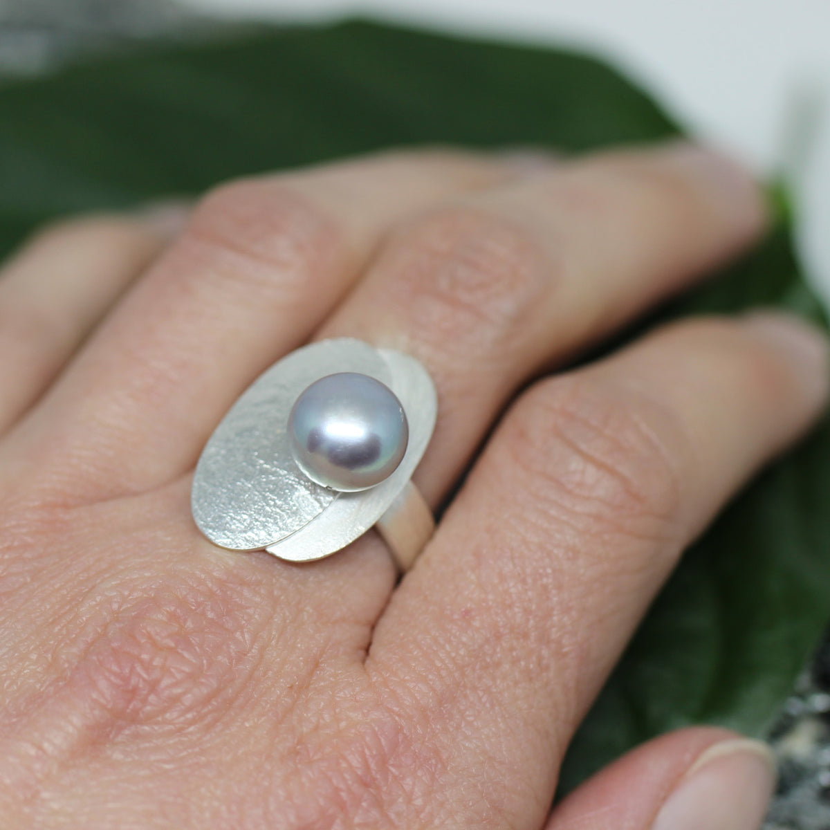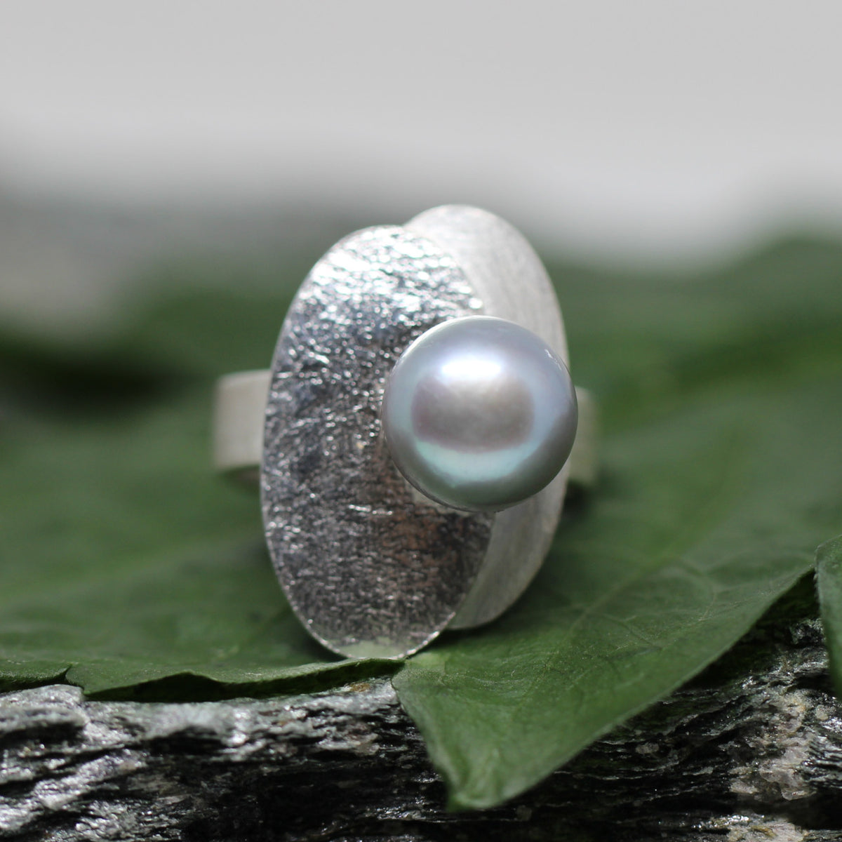 Diesen besonderen Ring haben wir in unserer Goldschmiede hergestellt. Das Schmuckstück ist aus 925er Sterlingsilber geschmiedet und die Oberfläche mit unterschiedlicher Struktur bearbeitet. Als Besonderheit haben wir eine graue Süßwasserperle eingefügt. Dieses Schmuckstück ist modern und zeitlos zugleich.