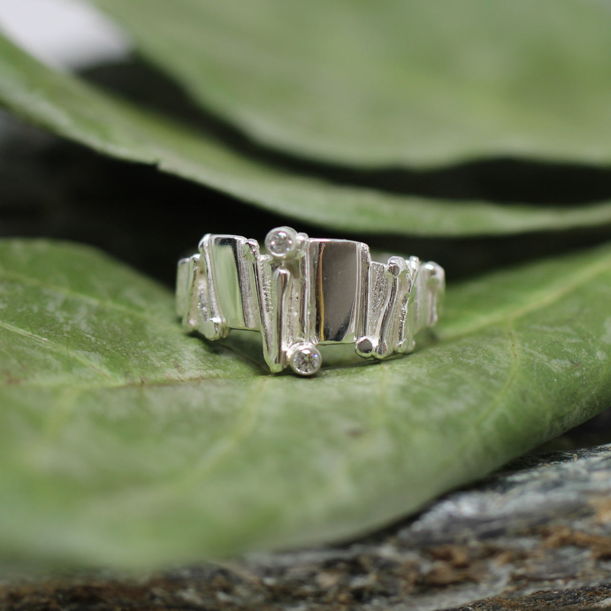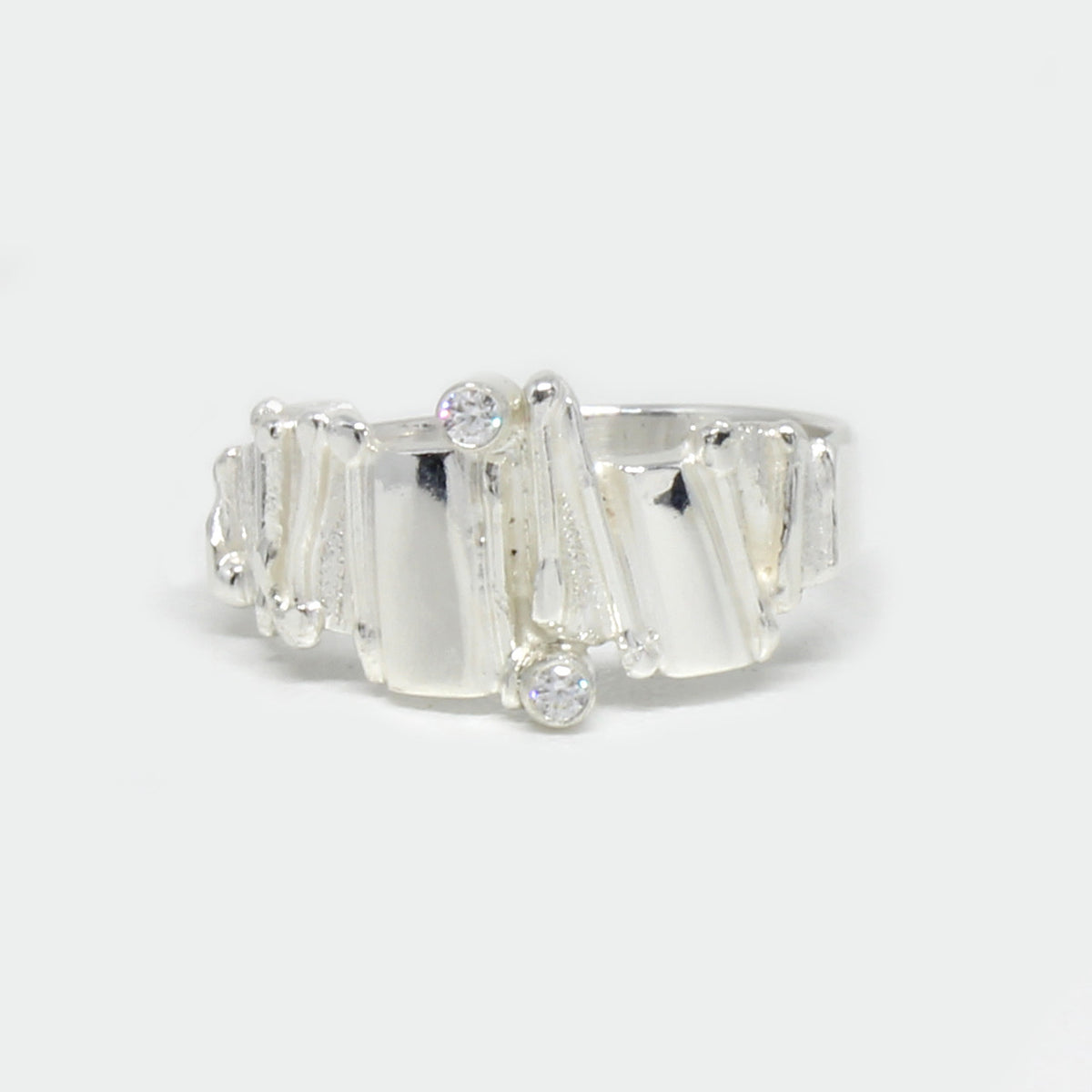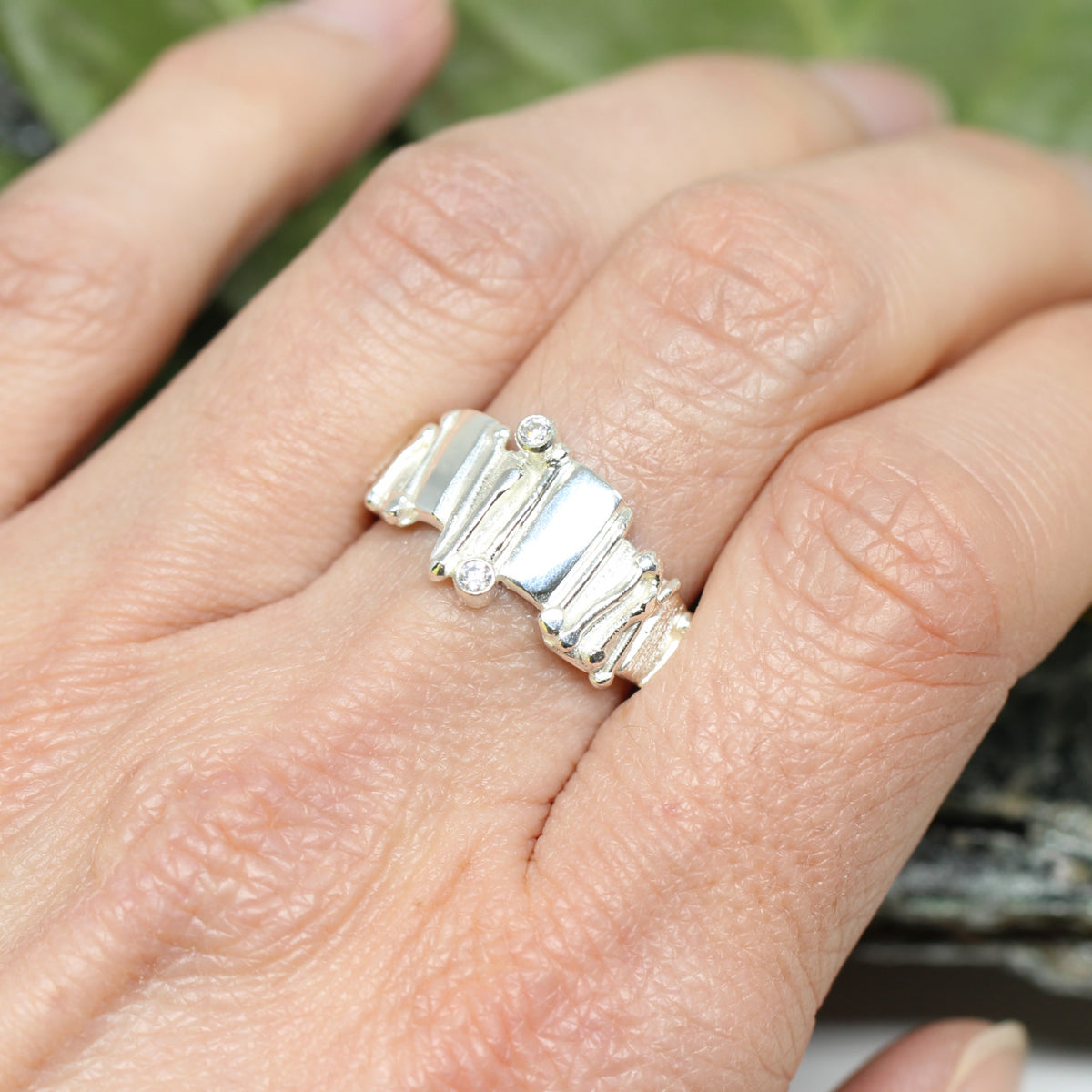 Ein ausdrucksstarkes Schmuckstück zeigt sich in diesem handgefertigten Ring. Wir haben ihn in unserem Atelier designed und direkt in die Tat umgesetzt. Wir haben den Ring aus 925er Sterlingsilber geschmiedet. Die unregelmäßige Struktur befindet sich nur auf dem Ringkopf. Mit einer glatten Ringschiene lässt er sich angenehm tragen und behält den Fokus auf dem Ringoberteil. Als kleine Highlights haben wir zwei Zirkonia eingefasst.